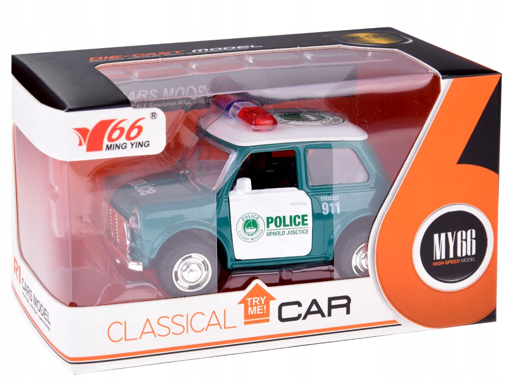 - металевий автомобіль із гумовими шинами та дверима, що відкриваються, ідеально підходить для багатьох поліцейських гаражів тощо. Автомобіль повністю металевий і має двері, що відкриваються. Завдяки невеликому розміру поміститься в ручці маленької дитини. Машинка зроблена дуже акуратно і естетично, напевно порадує кожного маленького колекціонера 4 коліс. Маленька, але акуратна модель не потребує батарейок і рухається за допомогою механізму відтягування - потягніть назад і відпустіть. Автомобіль неодмінно приверне увагу кожної дитини та колекціонера.