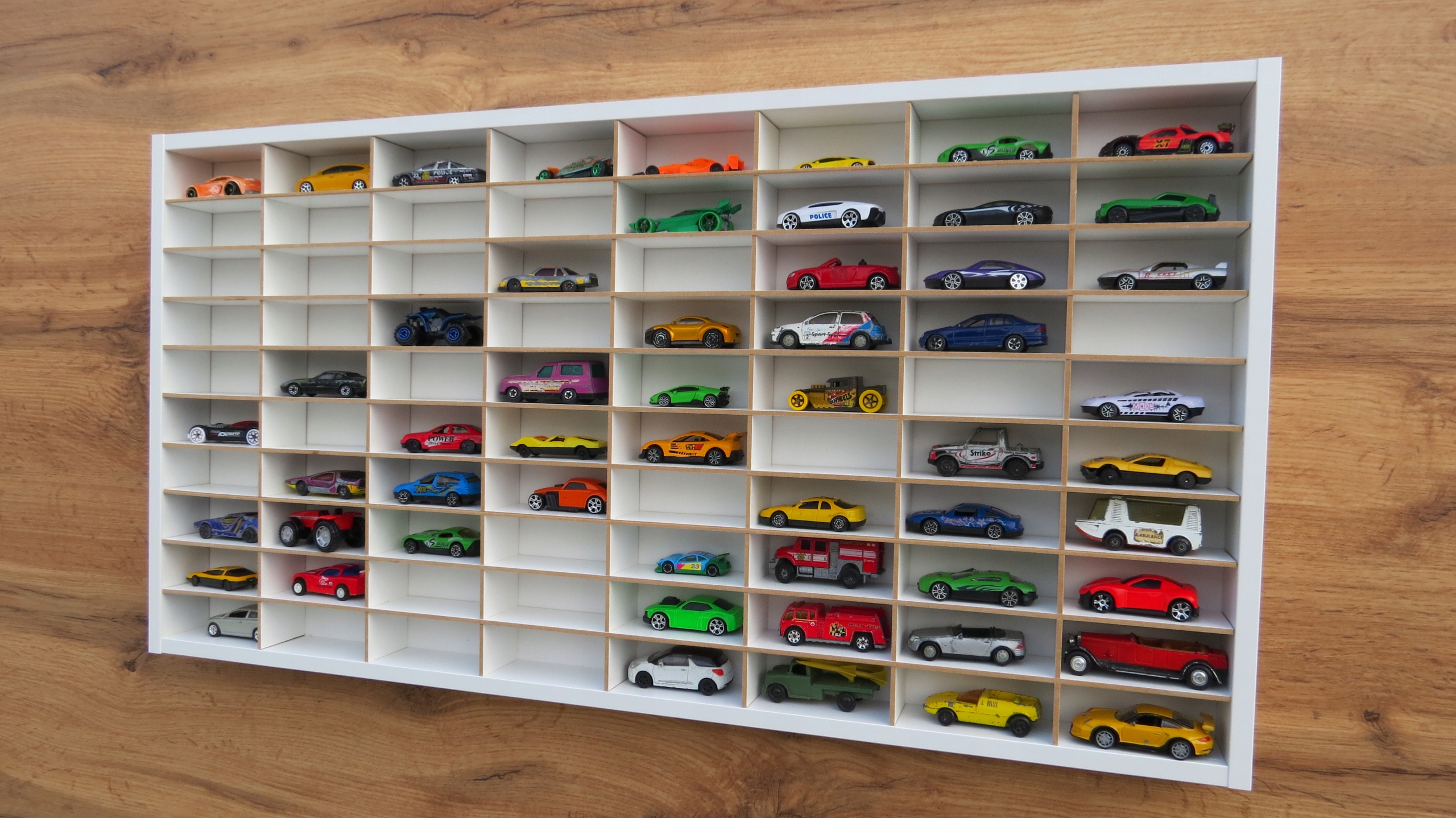 🚗 Ваші пружини в коробках чи в ящику? Настав час це змінити! Біла настінна полиця з 80 відділеннями дозволить вам елегантно виставити свою колекцію автомобілів Hot Wheels та інших моделей у подібному масштабі.