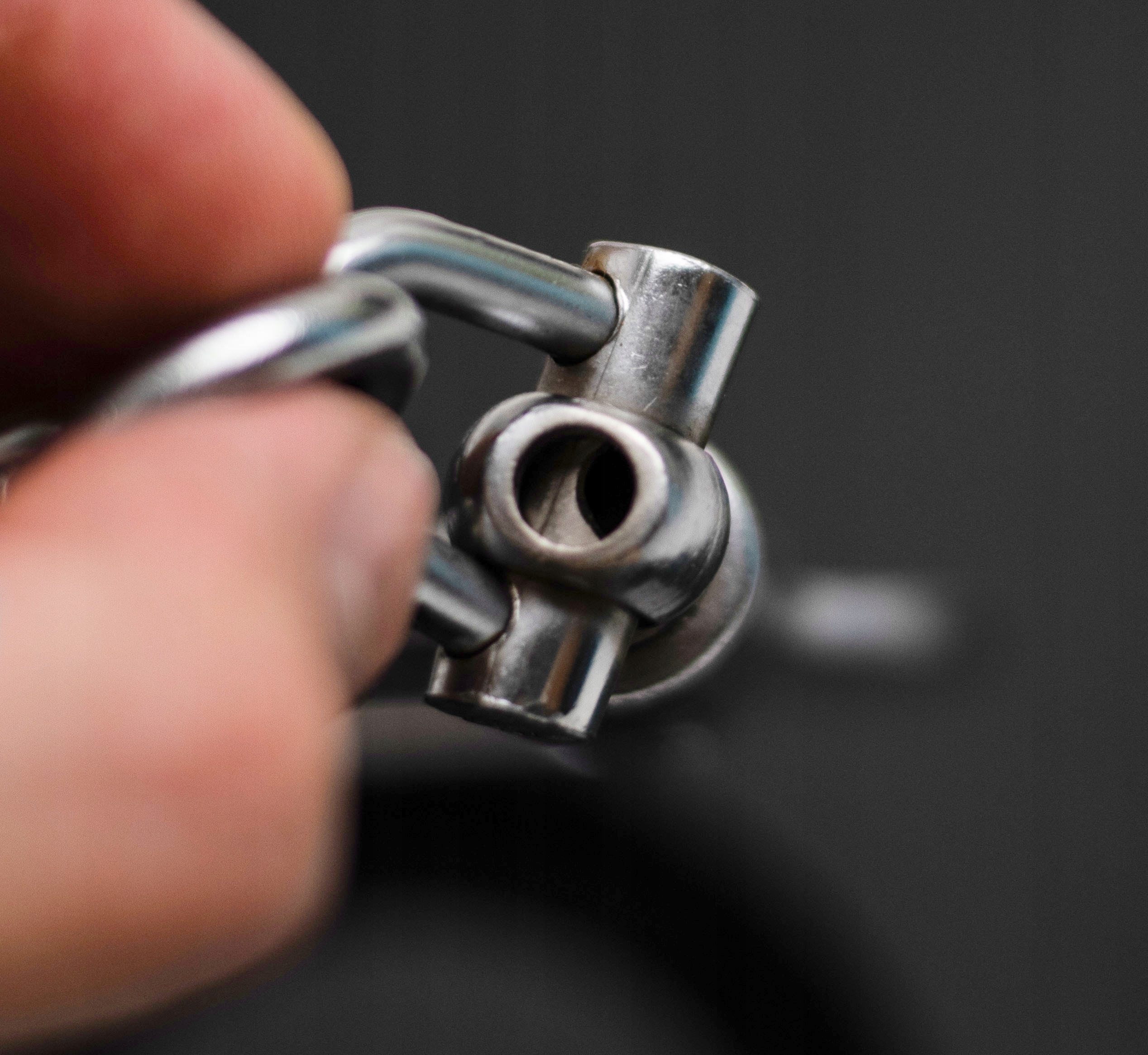 - Цікавим прикладом інноваційної безпеки є ключі від цих наручників, вони мають трикутний отвір на кінці, вони відповідають замку з такою ж формою отвору. Механізм ковзання ланцюга, який з’єднує наручники, є унікальним, що ускладнює відкриття наручників. У цьому випадку оператор наручників мав би перемістити ланцюг у правильному напрямку, щоб звільнити затриманих.