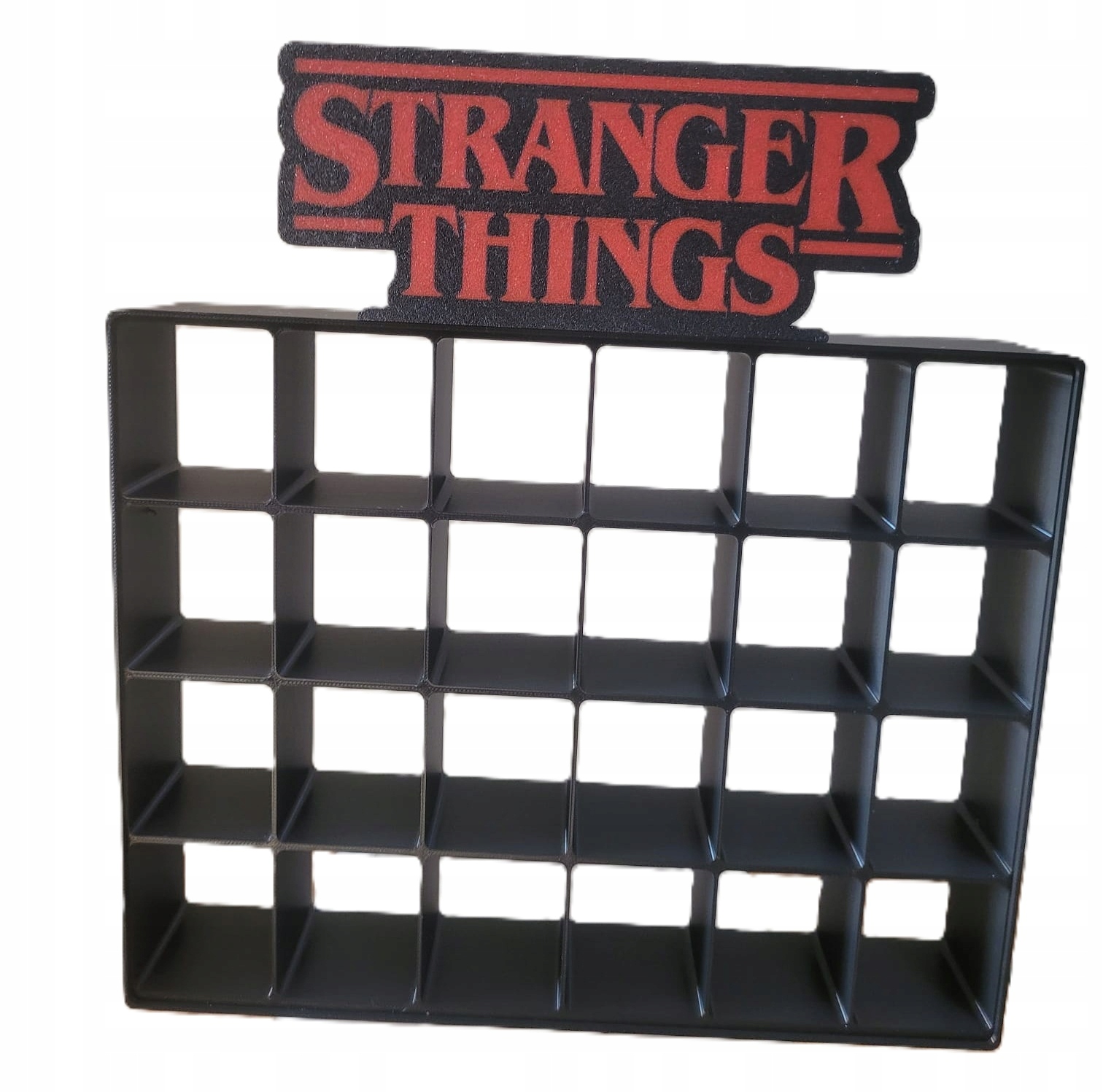 На полиці є місце для всіх 24 фігурок із цього видання. Прикрашений характерним червоним написом "Stranger Things" - чудово виглядає на столі, полиці чи стіні.