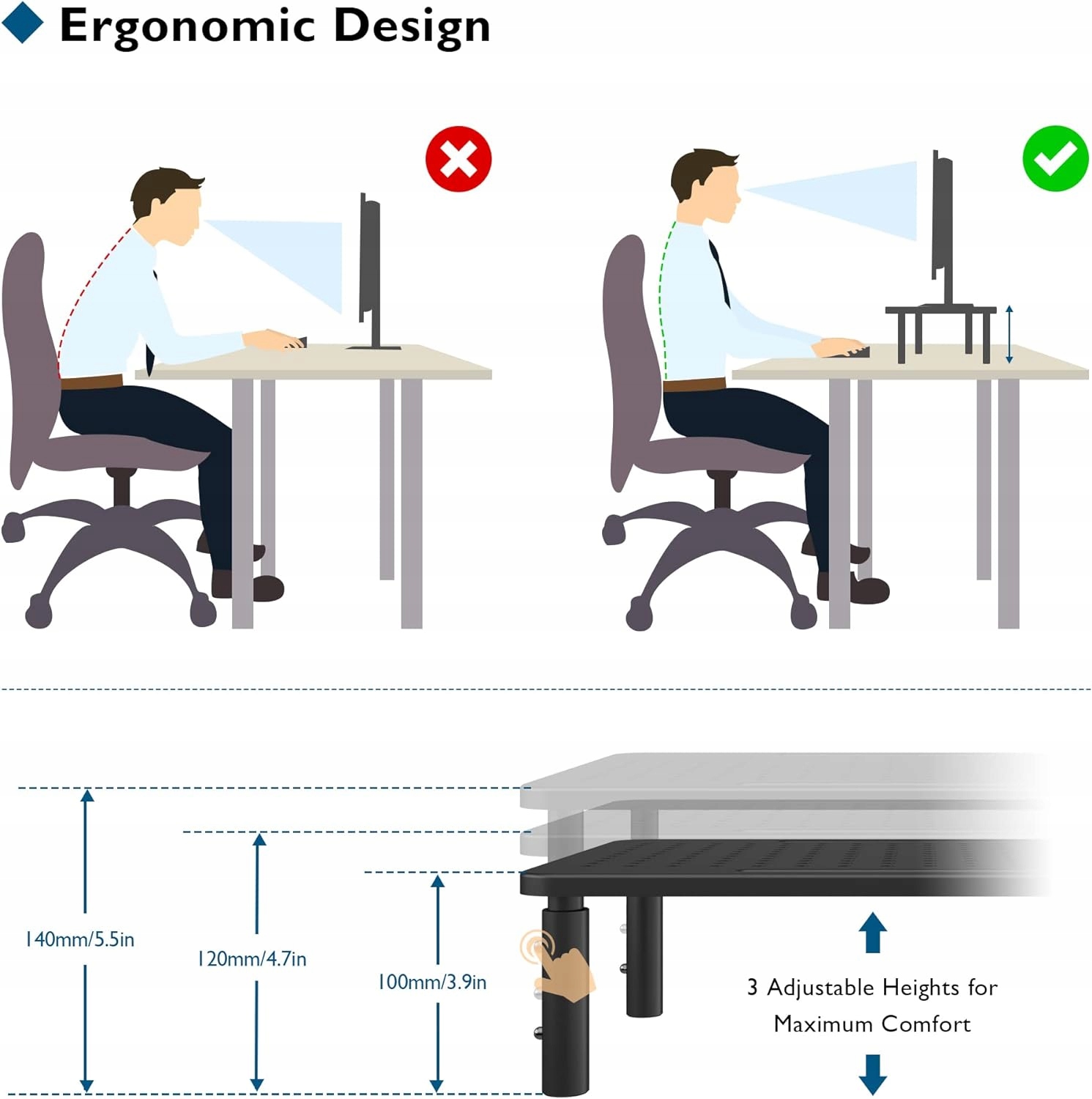 - Ергономічний дизайн: завдяки трьом регульованим рівням висоти (100/120/140 мм) стійка для подвійного монітора переміщує екран комп’ютера в ергономічне положення, що допоможе виправити вашу поставу і полегшити біль у шиї, спині та суглобах, спричинений довгим сидінням перед комп’ютером. Просто натисніть кнопку та підніміть платформу, щоб відрегулювати її висоту.