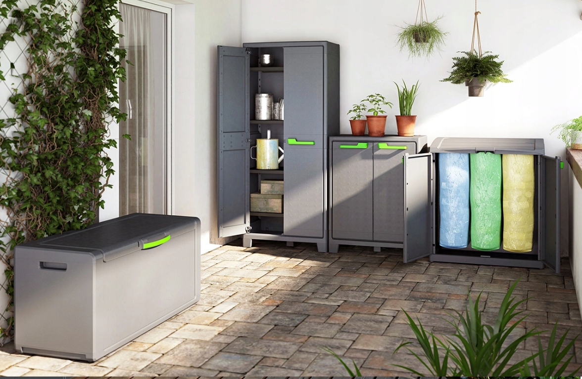 - Шафа виготовлена з високоякісного пластику, який стійкий до вологи та УФ-випромінювання. Завдяки цьому його можна використовувати на балконі або терасі. Конструкція стоїть на п'яти піднятих регульованих ніжках, що полегшує дотримання порядку.