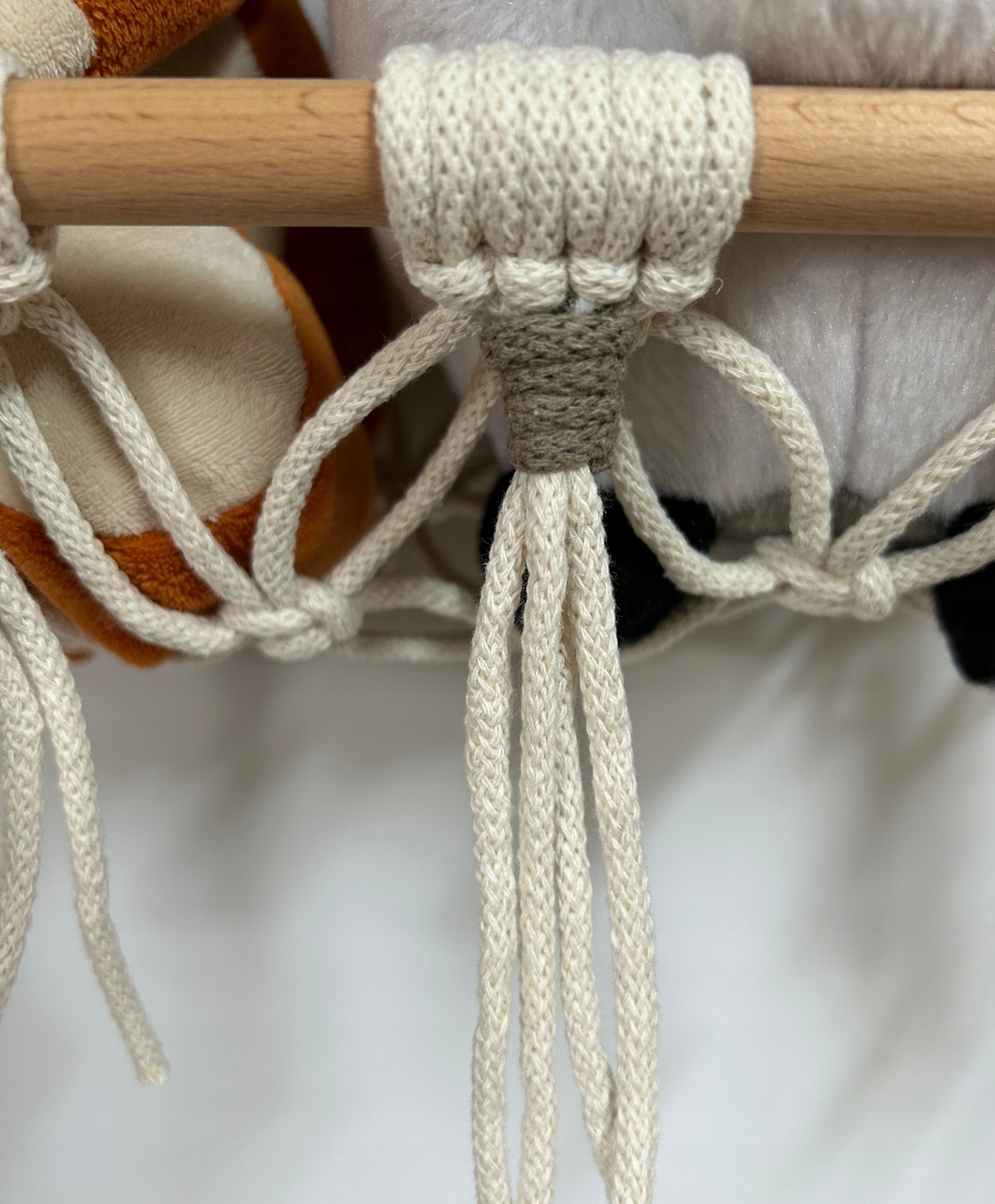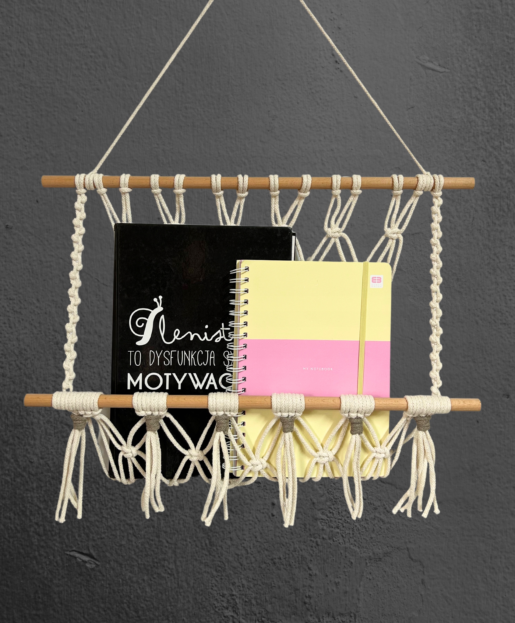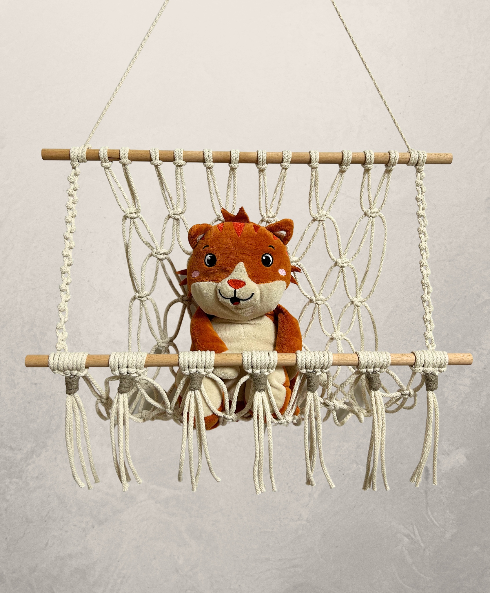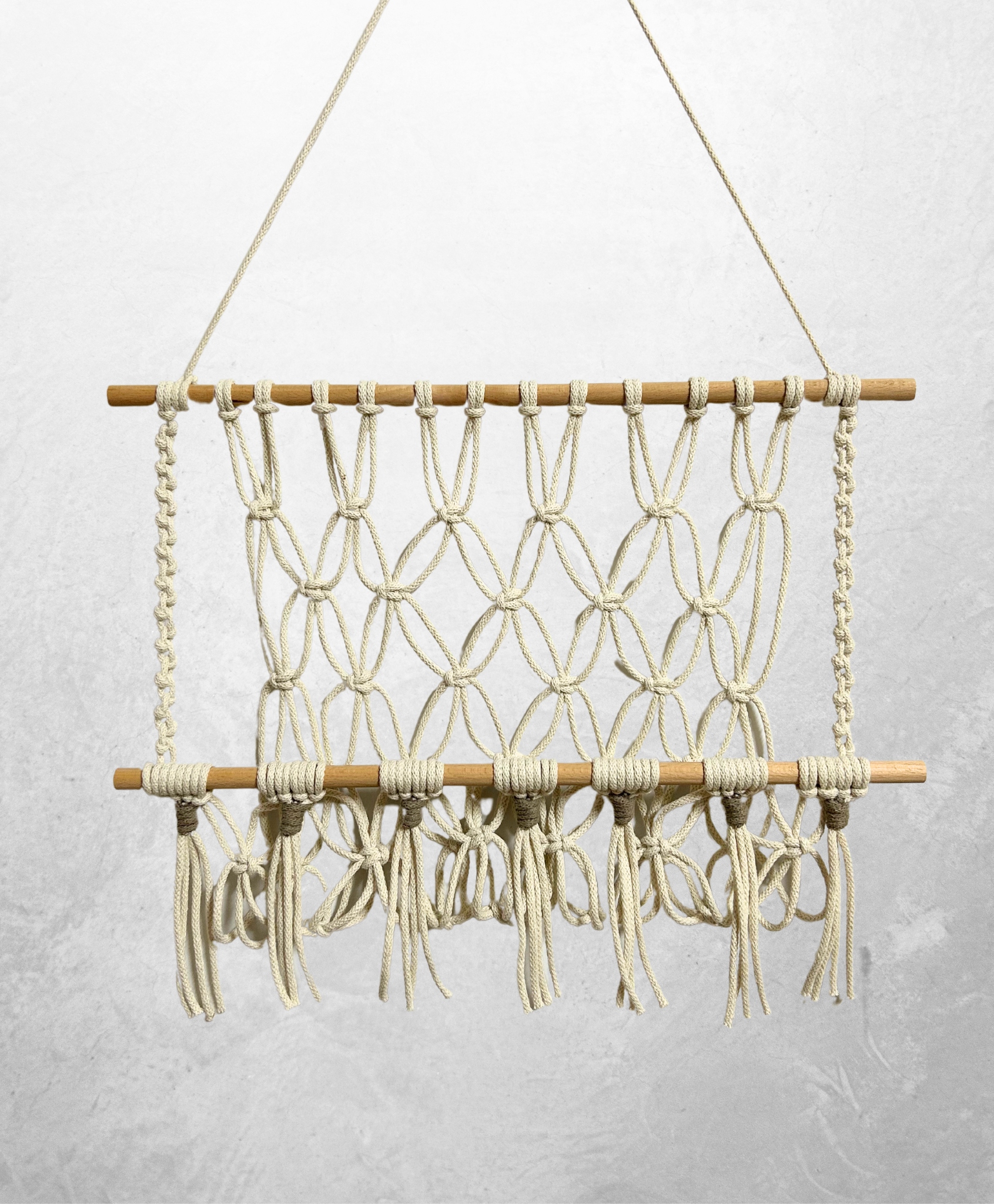 Предметом аукціону є поличка/гамак виготовлена своїми руками в техніці макраме для зберігання улюблених м'яких тварин або інших речей, які хочеться завжди мати під рукою. Полиця виготовлена з бавовняної нитки кольору слонової кістки товщиною 5 мм з декоративними елементами темно-бежевого кольору. Все це сплетено на двох дерев’яних палицях.