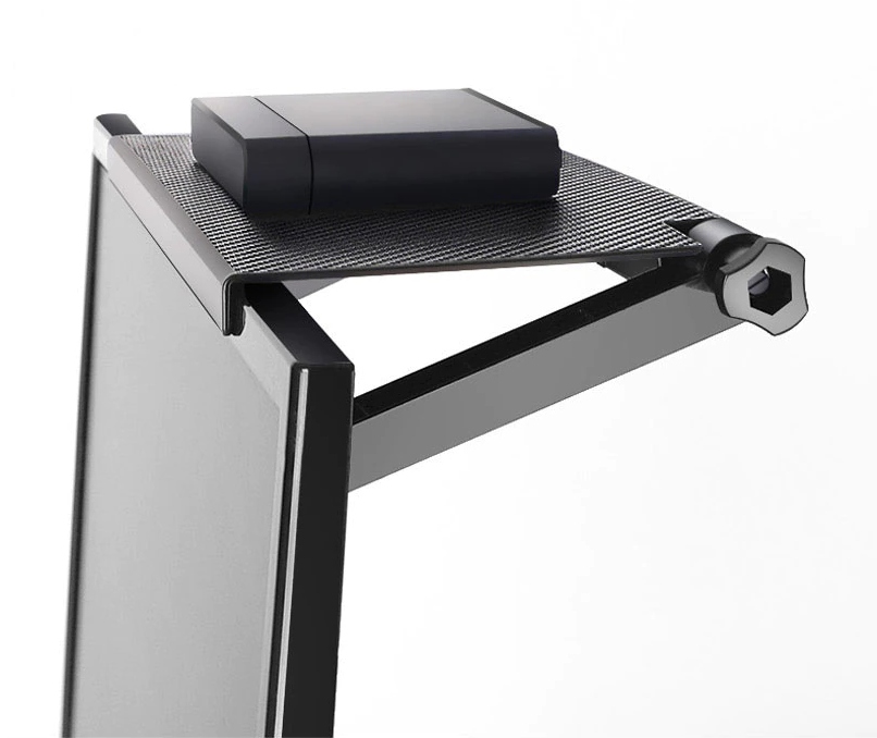 Поличка може бути встановлена на будь-який монітор або телевізор з плоским екраном. Завдяки регульованим опорам вам не потрібні інструменти для встановлення. Просто помістіть його вгору екрана, відрегулюйте опори та зафіксуйте, затягнувши ручку.