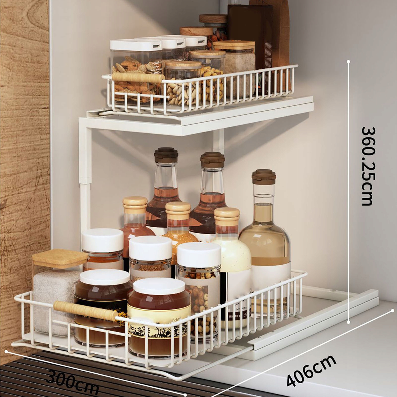 2. Подвійний шар: ця полиця під раковиною має двошарову висувну раму, яка дозволяє гнучко регулювати простір для зберігання на різній висоті для кращого сортування та організації предметів.