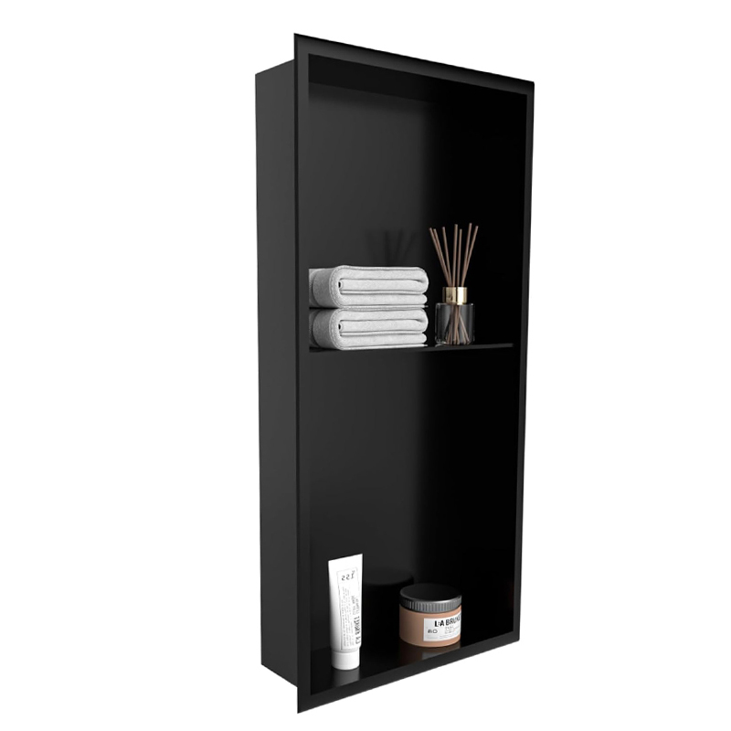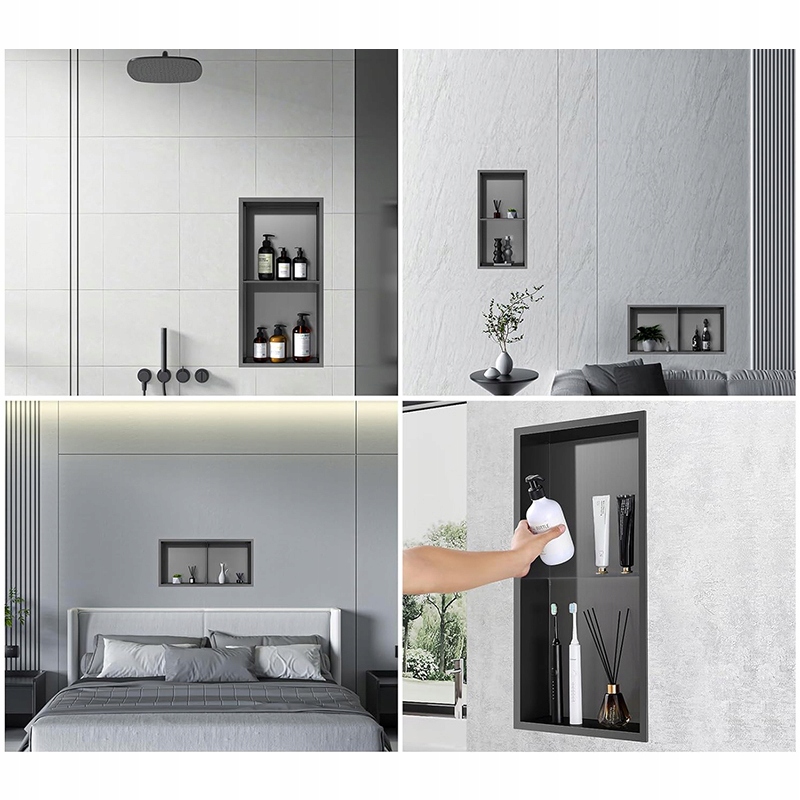✅ Вертикальна або горизонтальна установка– Полицю можна монтувати в стіну в обох напрямках, що полегшує її адаптацію до планування ніші та способу використання простору. Добре працює як у вузькій, так і в широкій зоні ванної кімнати.