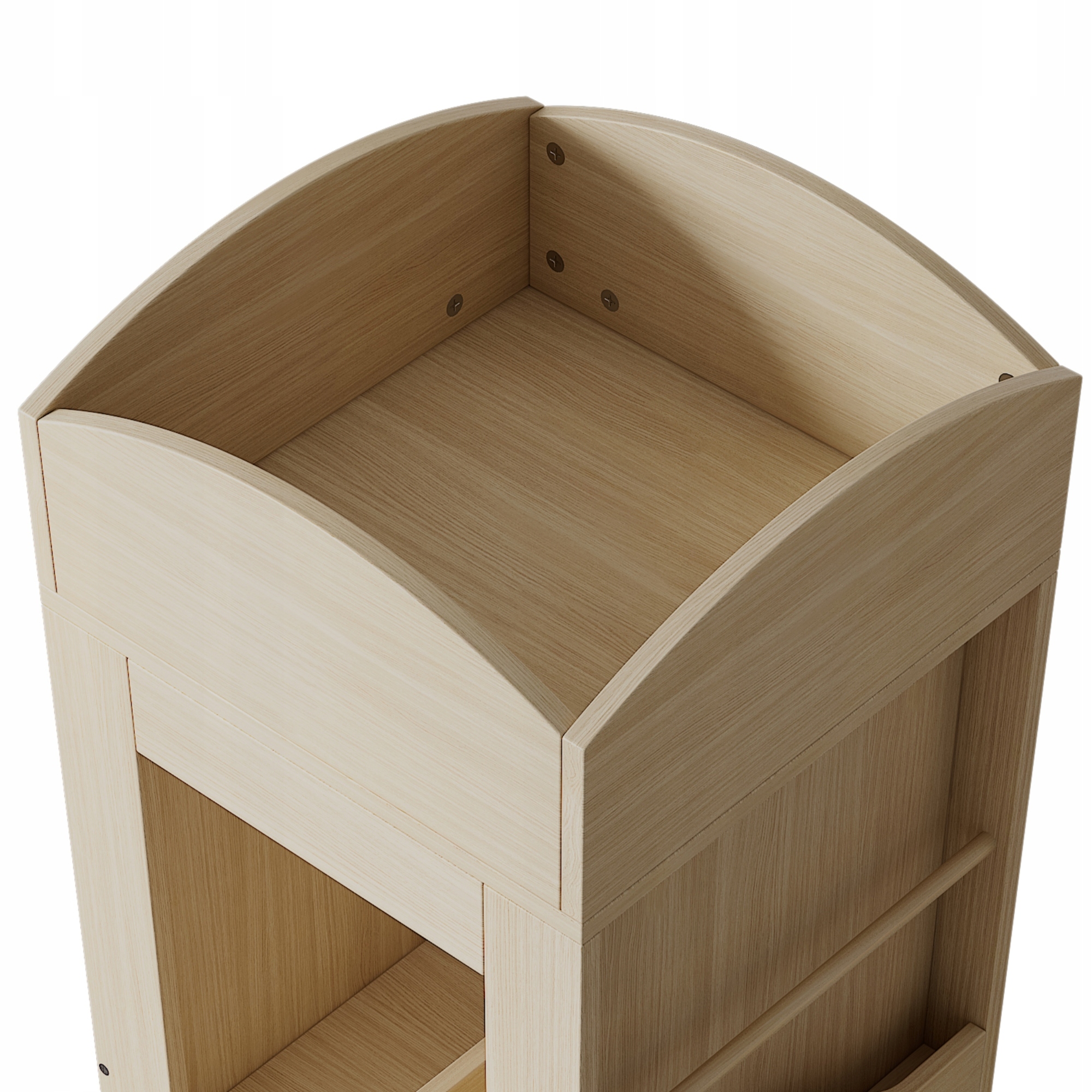 - Три рівні для книг із двома знімними підставками між ними. Бічні відділення для зберігання книжок із картинками та журналів із міцними дерев’яними поручнями для запобігання падінню книжок. У верхній частині достатньо місця для іграшок і повсякденних речей.