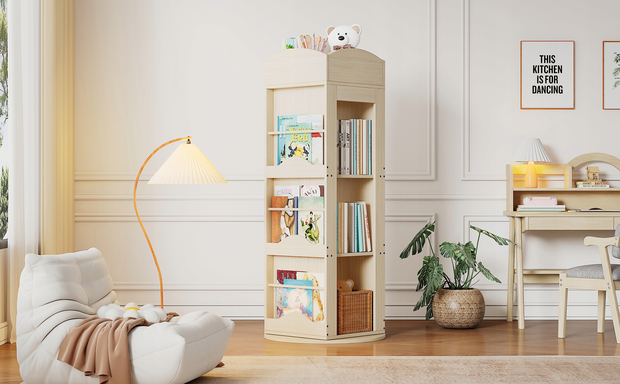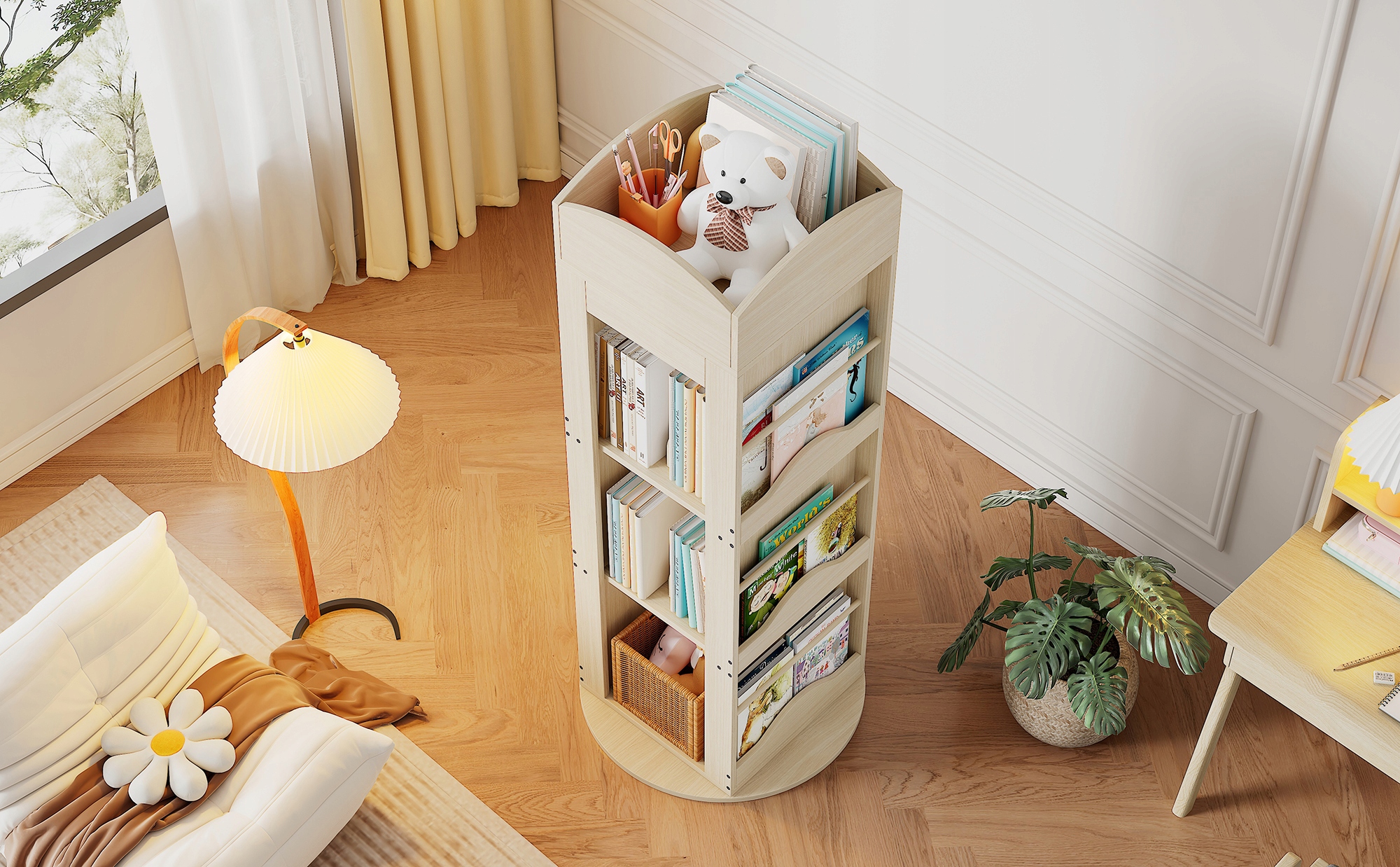 - Ця поворотна полиця має безшумний механізм повороту внизу, що забезпечує плавне обертання на 360 градусів. Легкий доступ до книг без запаху та клею забезпечує чудову стабільність і довговічність.