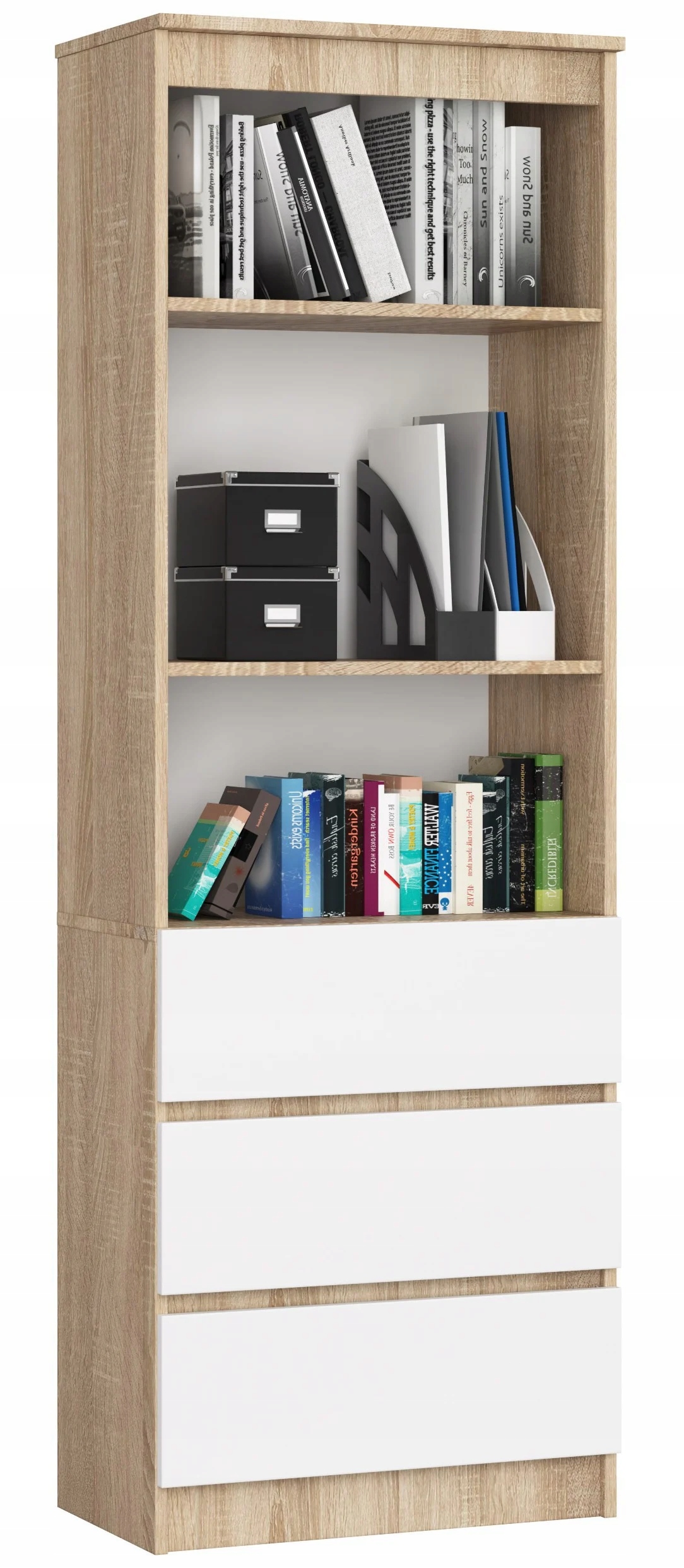 Офісна полиця моделі CLP вирізняється унікальним поєднанням кольорів. Натуральний колір дуба сонома корпусу меблів і універсальний білий колір фасадів ящиків - ідеальне поєднання, яке ідеально впишеться в стиль сучасного офісу та домашнього кабінету. Елегантний зовнішній вигляд - великий плюс цієї моделі.
