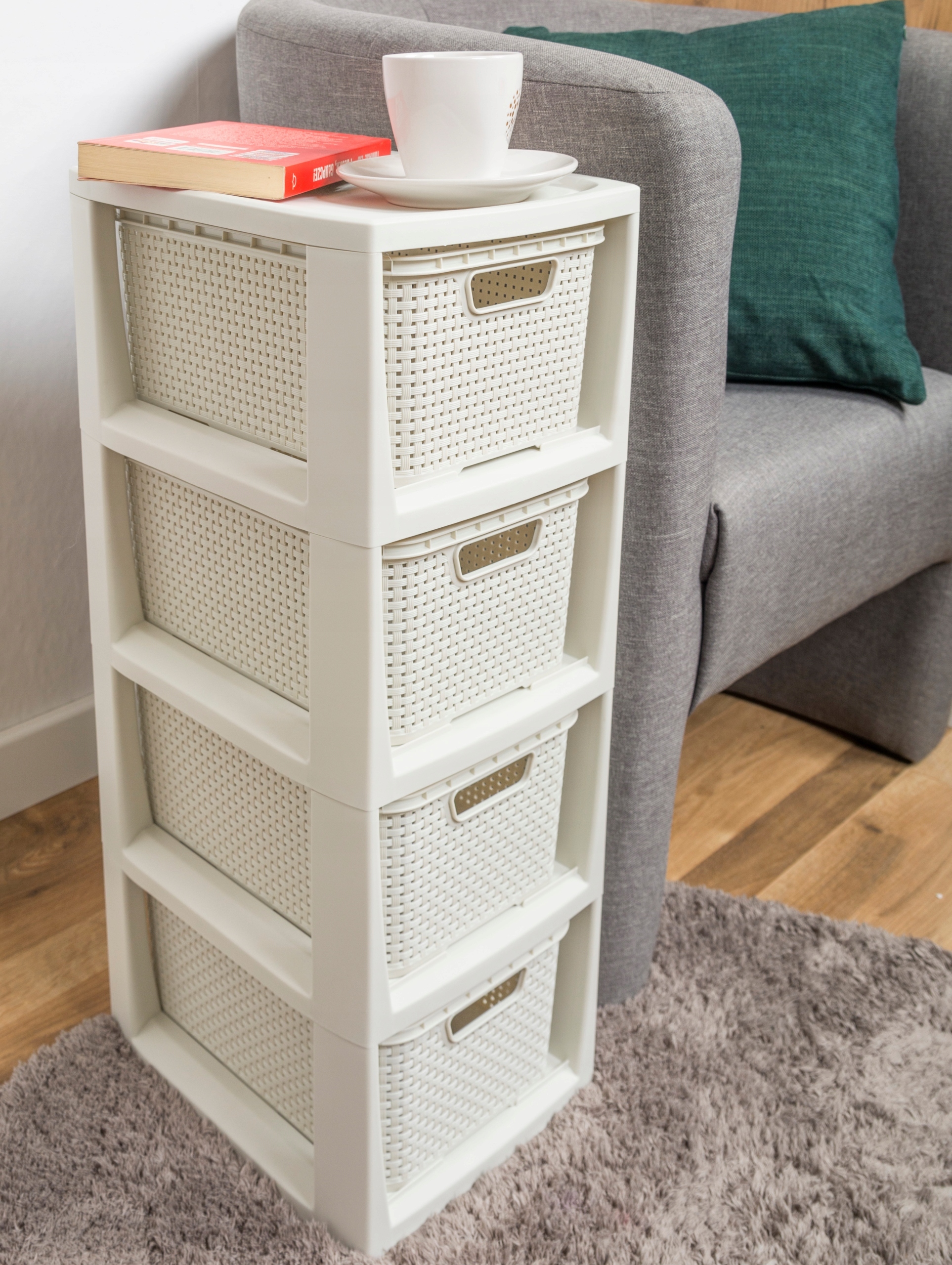 Полиця з ротанга, що складається з чотирьох частин, є дуже гарним рішенням для зберігання в невеликих приміщеннях.