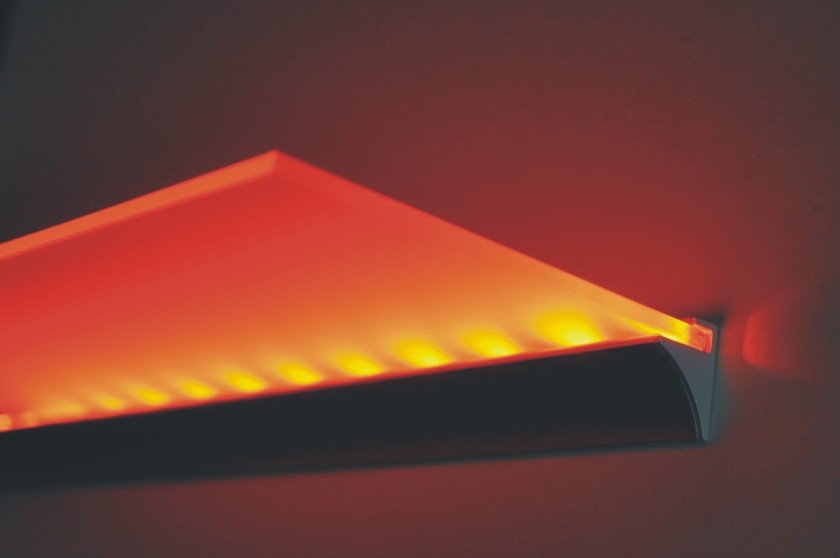 наклеїти стрічку, вставити полицю та підключити джерело живлення до розетки.