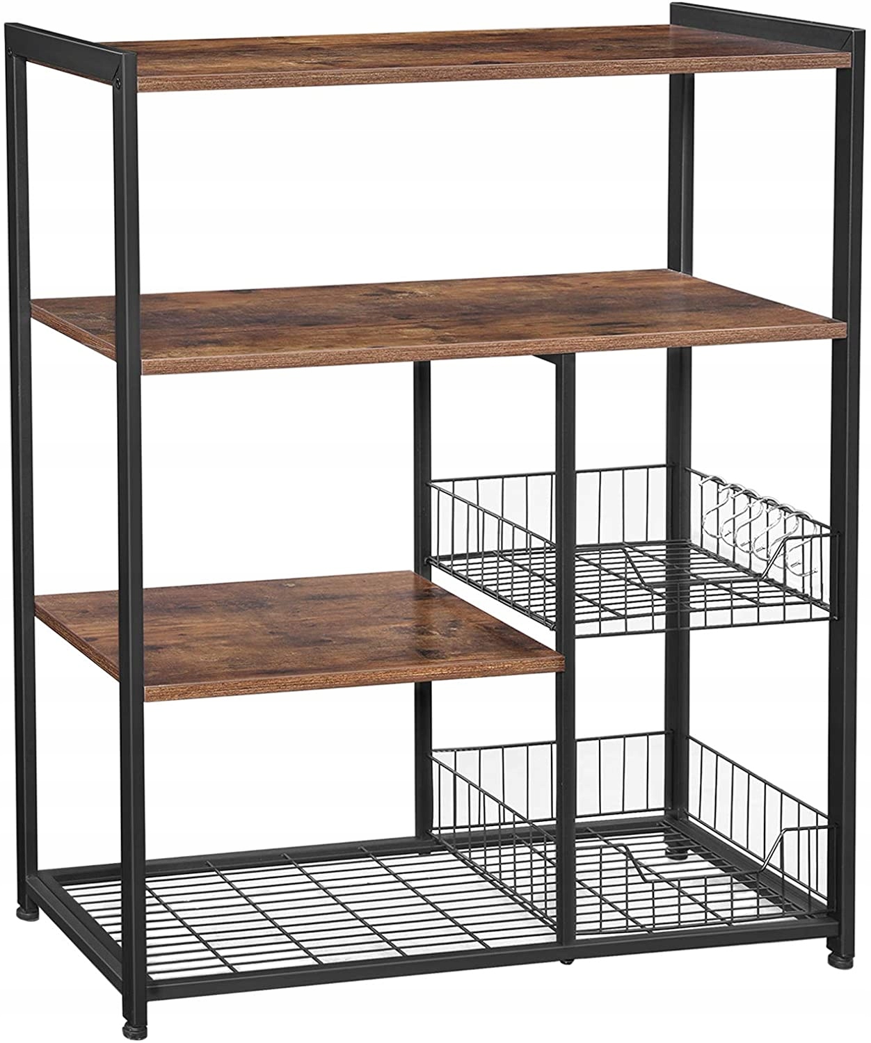Полиця з 2 сітчастими кошиками для фруктів глибиною 9 см і 6 гачками для ганчірок або посуду полегшує приготування їжі та повсякденне життя. Прямокутна сталева трубчаста конструкція товщиною 15 x 30 мм, міцні полиці з романтичним сільським деревом і регульовані ніжки забезпечують стійкість і збалансованість полиці.