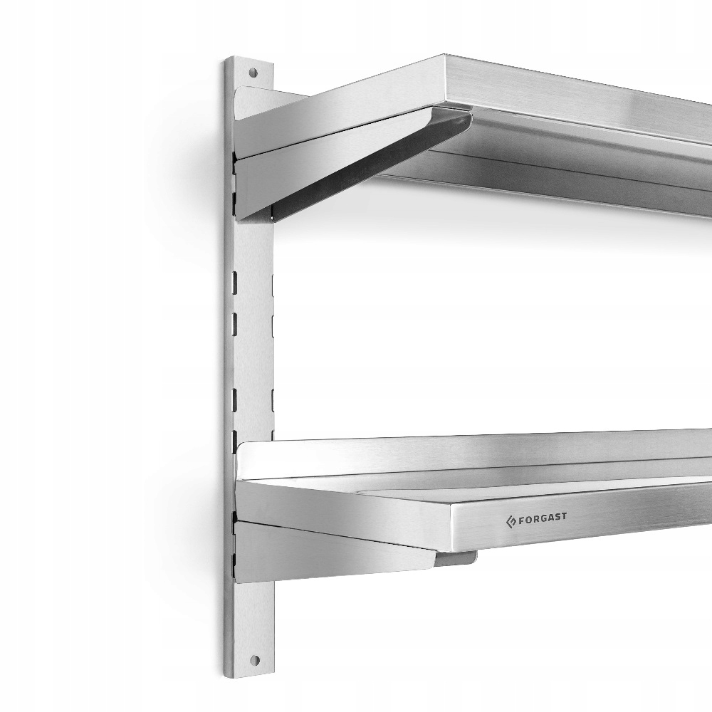 Навісна подвійна полиця з нержавіючої сталі Forgast, розміри 120x30x55 см. 2 стільниці вантажопідйомністю до 35 кг кожна. Краї з боку стіни для захисту від бруду. Монтажні аксесуари включені.