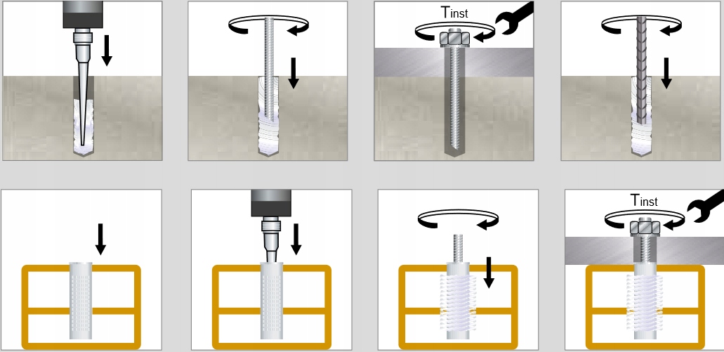 Перш ніж вставляти стрижень, перевірте, чи елемент сухий і очищений від масла та інші забруднення. Вставте стрижень з різьбленням, повертаючи його, щоб уникнути присутності повітря у встановленому отворі. Під час монтажу та наступної фази навантаження анкера слід дотримуватися відкритого часу та часу твердіння, зазначених у технічному паспорті та на етикетці продукту. Перед застосуванням анкера перевірте ступінь затвердіння вироби. Після закінчення часу застигання з’єднання готове до повного навантаження.