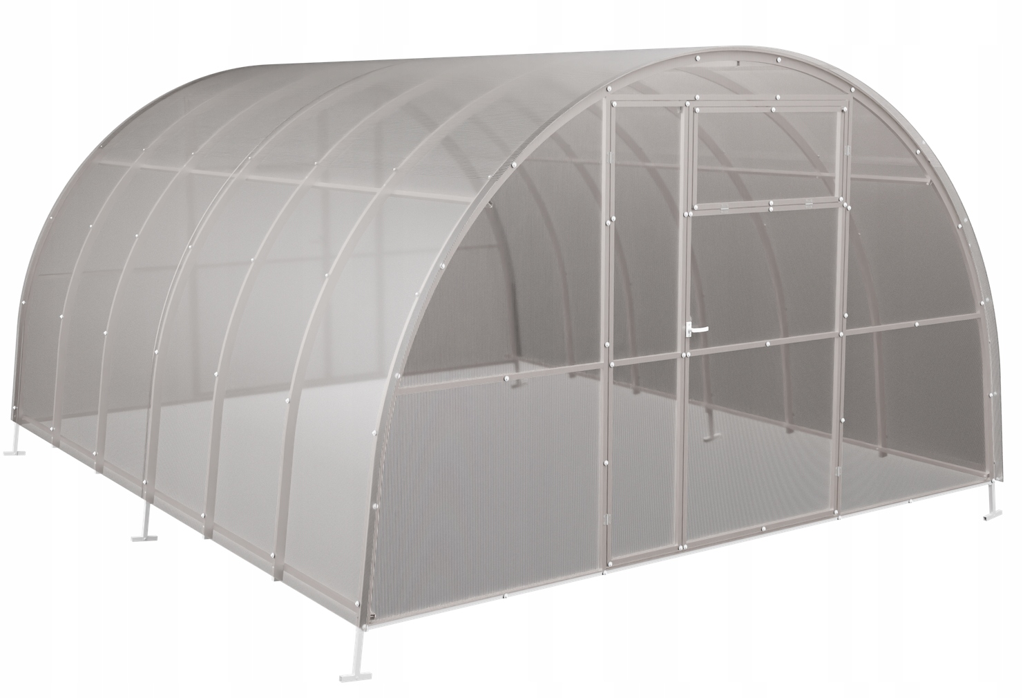 Сучасна та легка -TSTALL структура, виготовлена з сталі 0,8 мм гарячої -dip, оцинкована з обох боків. Луки, виготовлені з одного елемента - вони зігнуті, фронти зварені. Набір включає якорі "T" для землі та набір гвинтів. Обшивка виготовлена з камерного полікарбонату, стійкого до УФ -випромінювання.