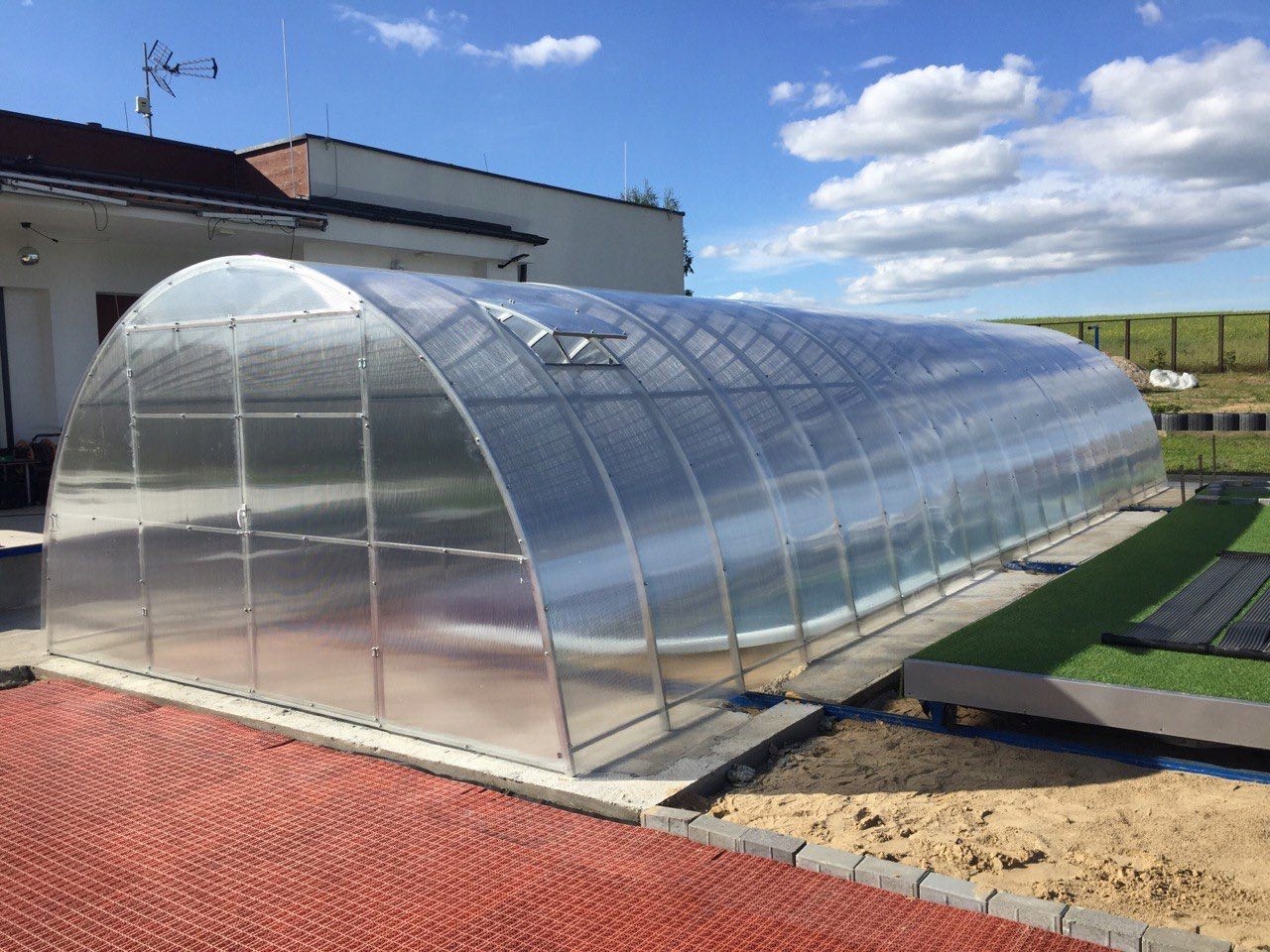 Сучасна та проста в установці конструкція зі сталі 0,8 мм, оцинкована гарячим способом з обох сторін. Арки зроблені з одного елемента - вони зігнуті, фасади зварені. У набір входять Т-подібні анкери для кріплення до землі та набір шурупів. Чохол виготовлений із стійкого полікарбонату, стійкого до УФ-випромінювання та граду. Напівкругла форма теплиці запобігає накопиченню снігу