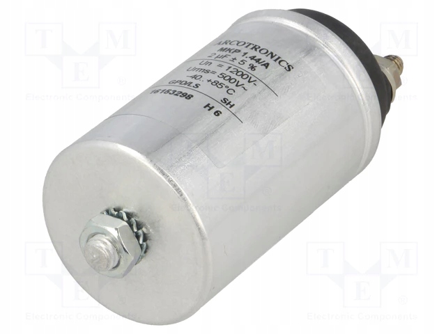 Виробник = KEMET; Кріплення = гвинт M8; Крок розводки = 22,3 мм; Робоча температура = -40...85°C; Допуск = ±5%; Розміри корпусу = ?45x80мм; Робоча напруга макс. = 500 В змінного струму, 1,2 кВ постійного струму; Тип конденсатора = поліпропіленовий; Штифти = гвинти M6; Ємність = 2 мкФ; Кліматична категорія = 40/85/21; Використання конденсатора = фільтрація; Імпульсний струм макс. = 600А; Робочий струм макс. = 15А; Опір ШОЕ = 2,5м?; Серія виробника = C44A