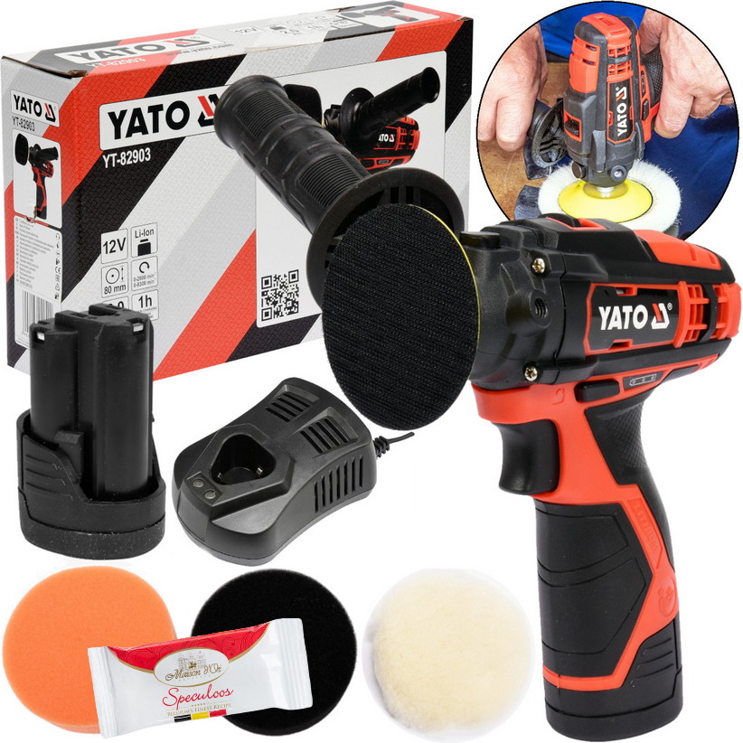 У наборі: акумулятор 2 AH YT-82909 та 1 години зарядки та 3 додаткові абразивні диски різної твердості (для воску та пасти)