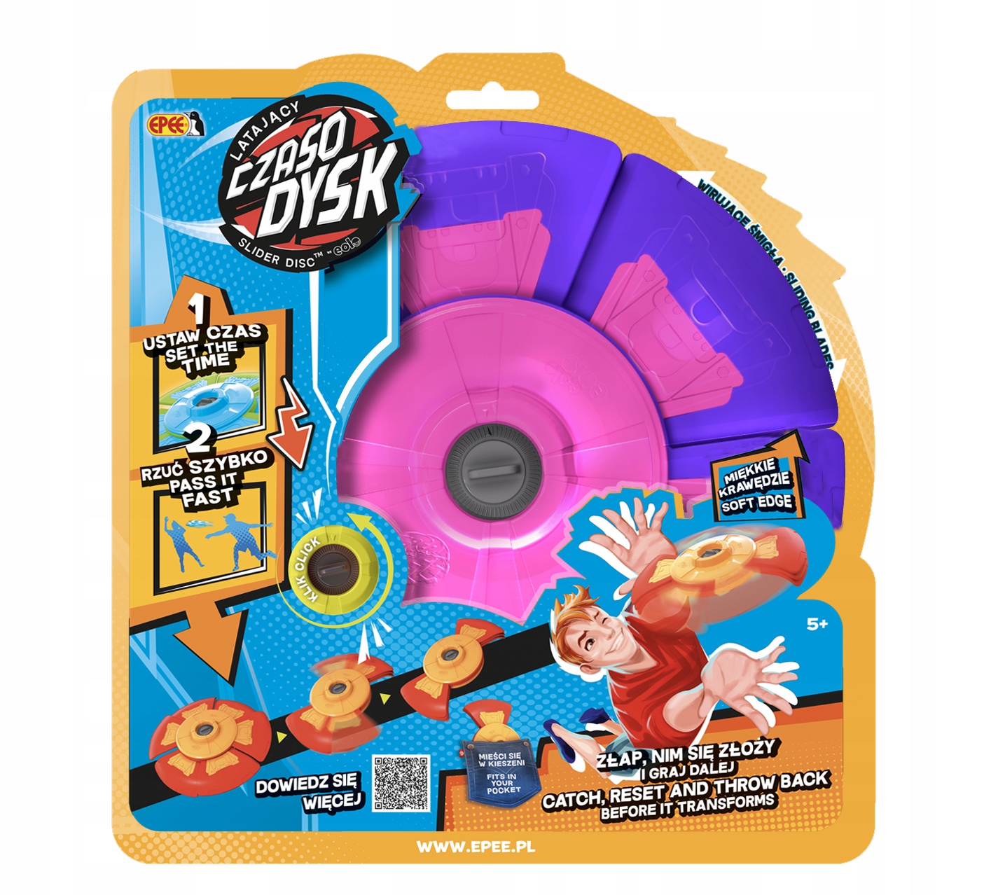 Фантастичний наступник улюбленої дітьми Dyskopiłka - Літаючого розкладу! Зловіть диск, поки він не згорнеться, встановіть час і передайте його! Це фантастична розвага, повна сміху та поворотів! Після складання диск поміститься навіть у кишені! Кольори: червоно-помаранчевий, фіолетово-рожевий, зелено-жовтий і синьо-помаранчевий.