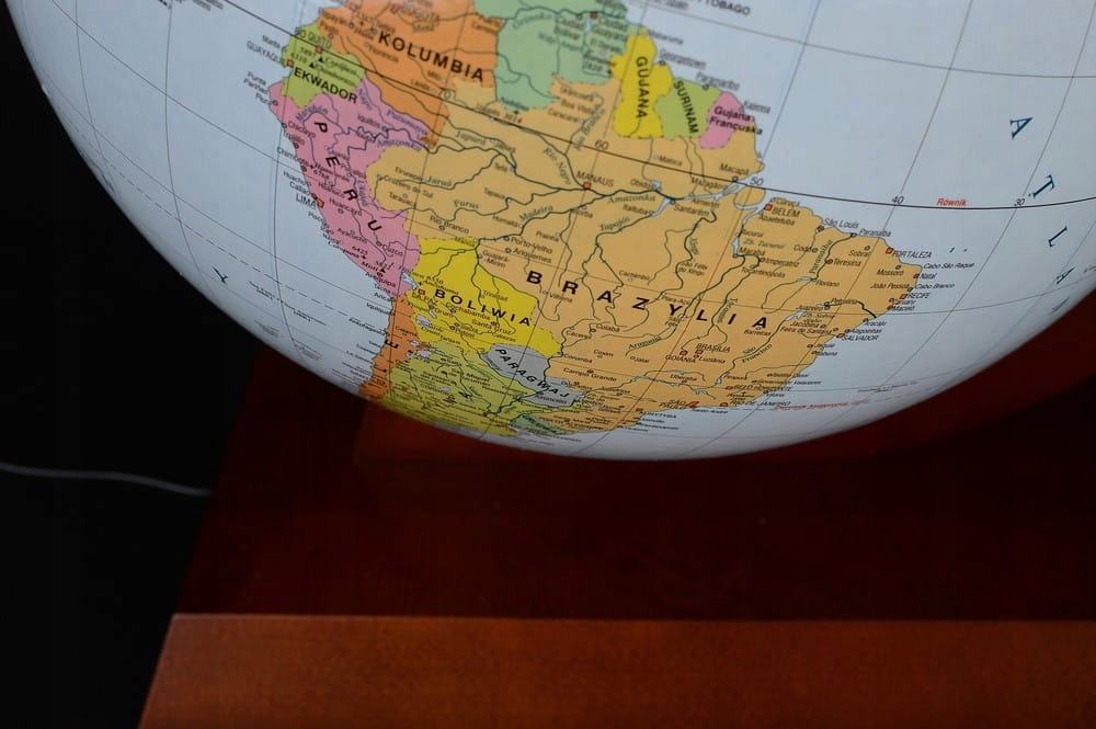 Глобальний глобус представляє політичну картографію, з країнами, позначеними окремими кольорами, містами та річковою мережею. Океани, моря та озера, позначені світло -блакитним.