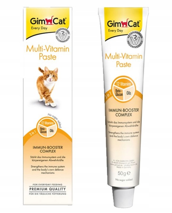 Вітамінна паста Gimcat містить між іншим вітаміном А, що відповідає за здоровий стан шкіри та належне функціонування ока. Вітамін Е працює як антиоксидант. Вітамін В регулює метаболізм. Біотін робить пальто блиск прекрасно. Таурин не виробляється в достатній кількості організмом і повинен постачатися харчовими продуктами. Він не тільки підтримує ваші очі, але й серцеві функції.