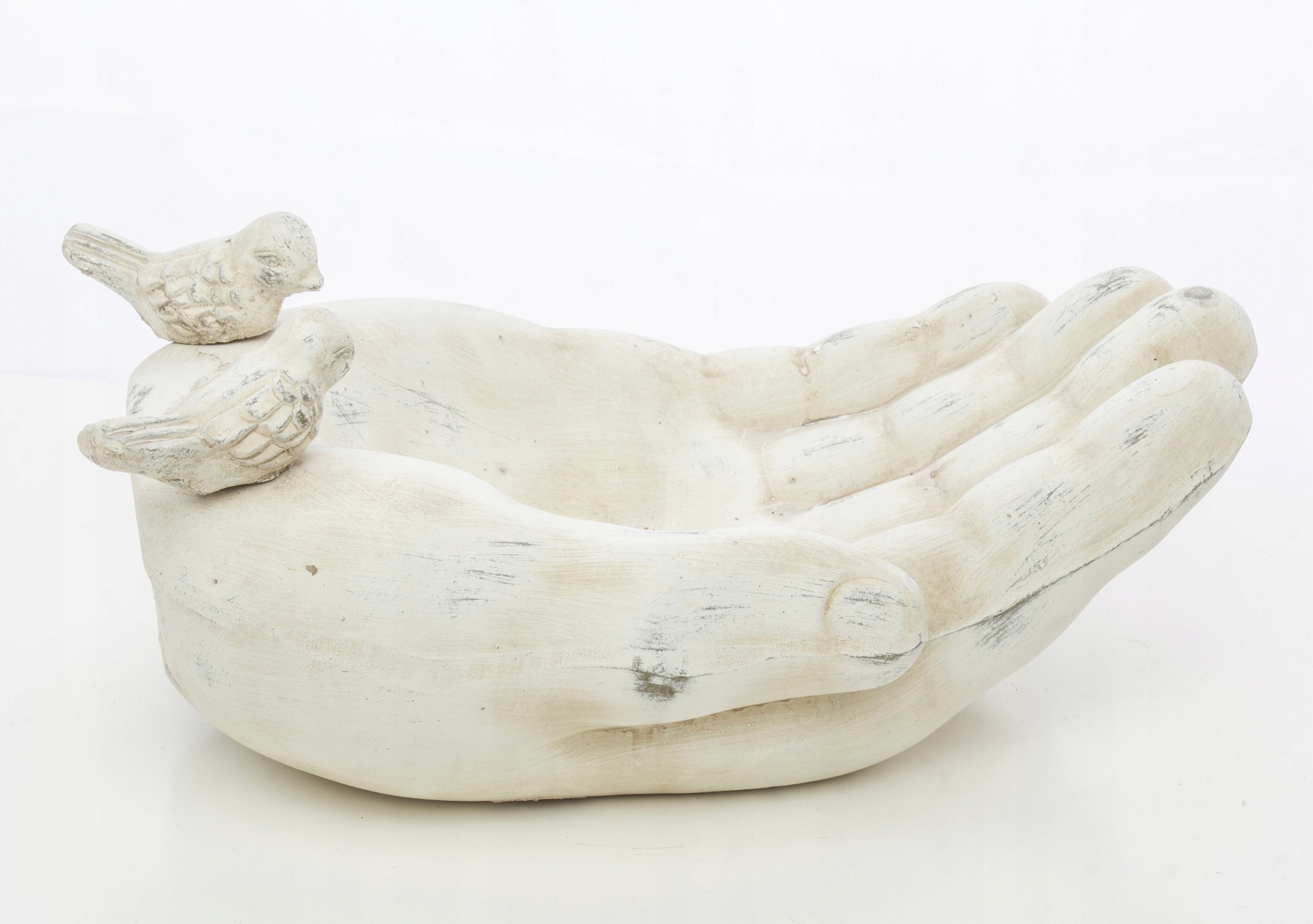 Цікаве оформлення чаші з парою птахів, що сидять на краю, і приглушені кольори роблять лійку унікальною прикрасою саду.