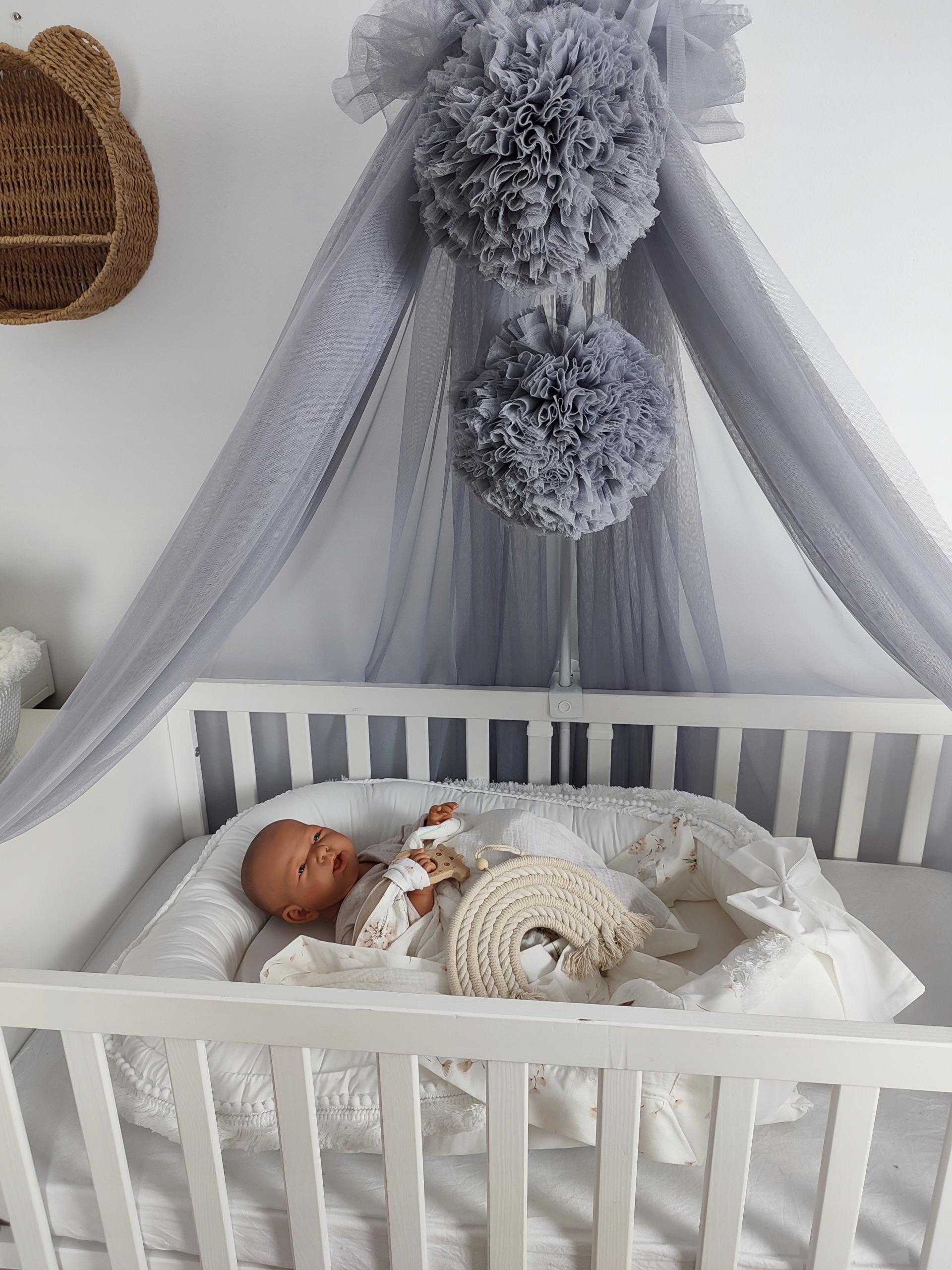 Ефектний балдахін з двома декоративними помпонами. Виготовлена з м'якого фатину та красивих пухнастих помпонів ручної роботи, які створюють неповторний ефект бохо. Для простої та стійкої установки над ліжком або в ігровому куточку.