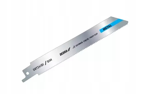 Полотно для шабельної пилки DEDRA 08T241BI для різання металу. Призначений для швидкого різання металу, товстого листового металу (3-8 мм), труб/профілів (10-100 мм). Пильний диск має максимальну довжину 150 мм і робочу довжину 125 мм. Виготовлений з біметальної сталі. Ефективне різання забезпечується належним чином підготовленою ріжучою поверхнею, тобто хвилястими, відфрезерованими зубами з щільністю 14TPI (14 зубів на дюйм)