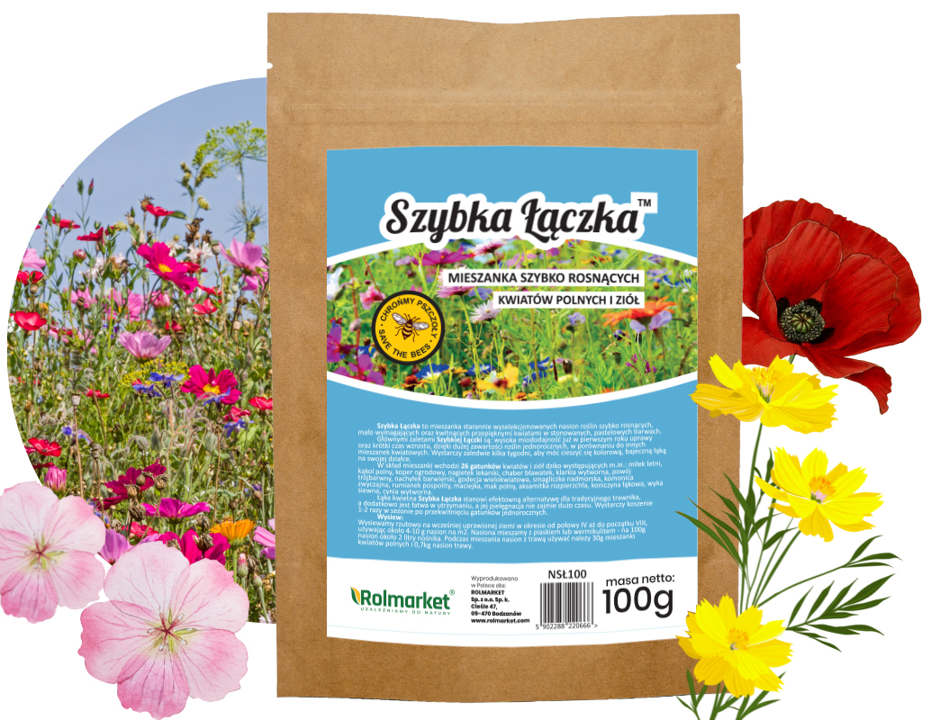 🌸 Основними перевагами Szybka Łączka є: висока медоносність. урожай вже в перший рік вирощування та короткий час росту завдяки високому вмісту однорічних рослин порівняно з іншими квітковими сумішами.