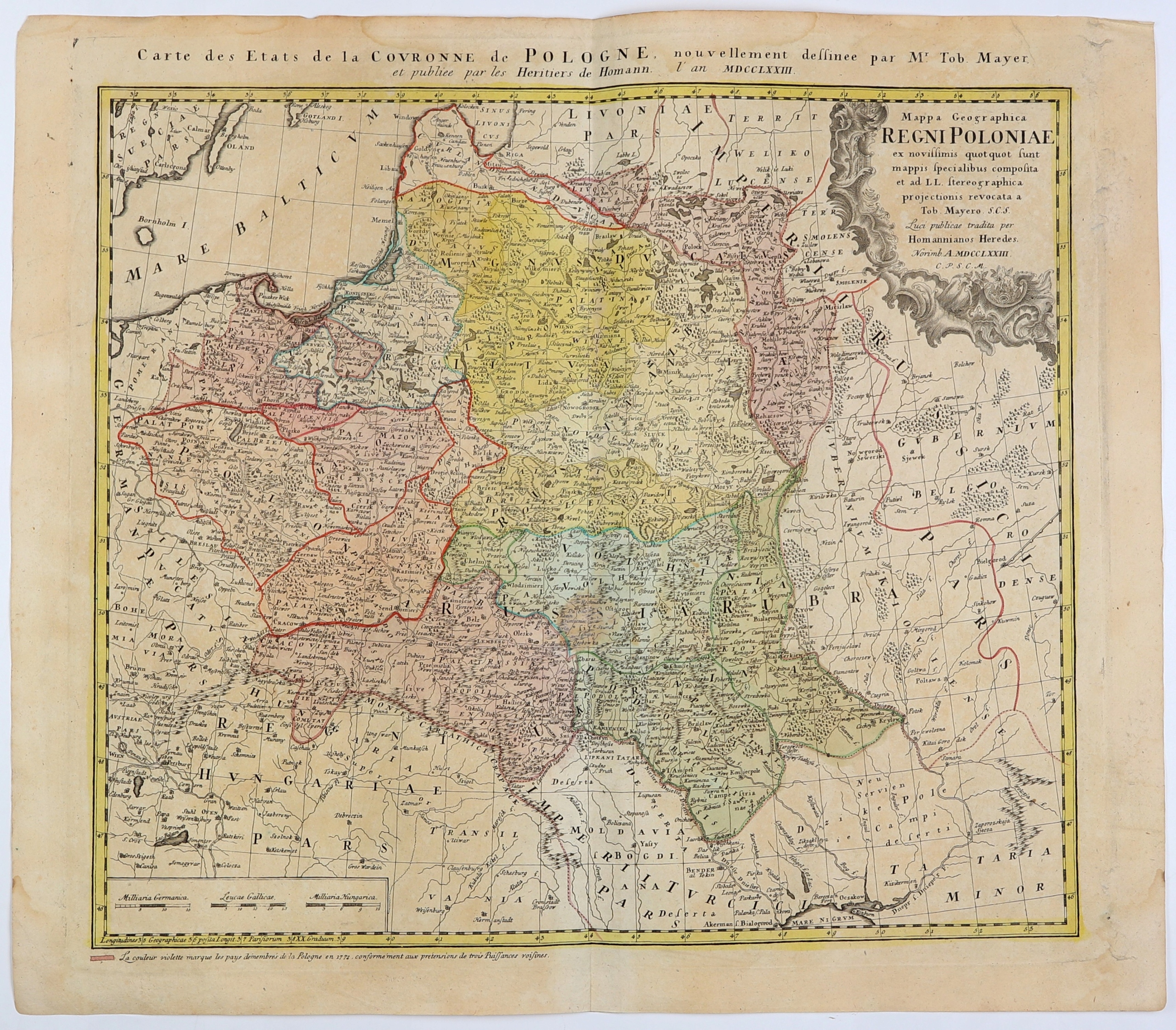 ПОЛЬЩА, ЛИТВА. Карта Республіки Польща; підготував Т. Маєр, видання «Спадкоємців Гоманна», 1773; над верхньою рамкою друга назва: Carte des Etats de la COVRONNE de POLOGNE...; кольорова гравюра на міді, складений аркуш, сліди вологи та забруднені поля; розміри дошки: прибл. 535x480 мм, розмір аркуша: бл. 595х513 мм; Mappa Geographica REGNI POLONIAE ex novissimis quot quot sunt mappis specialibus composita...