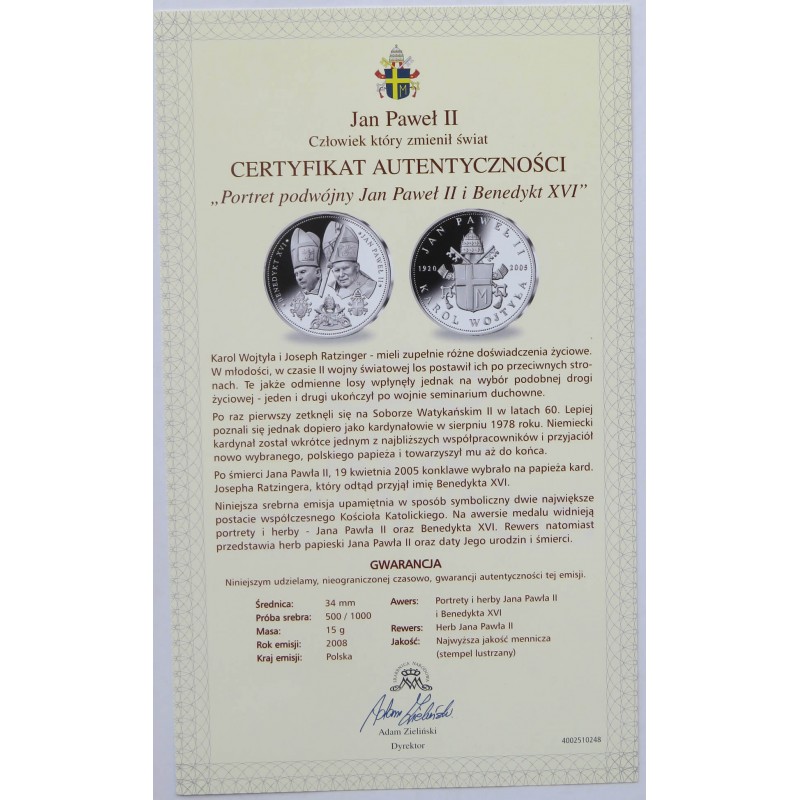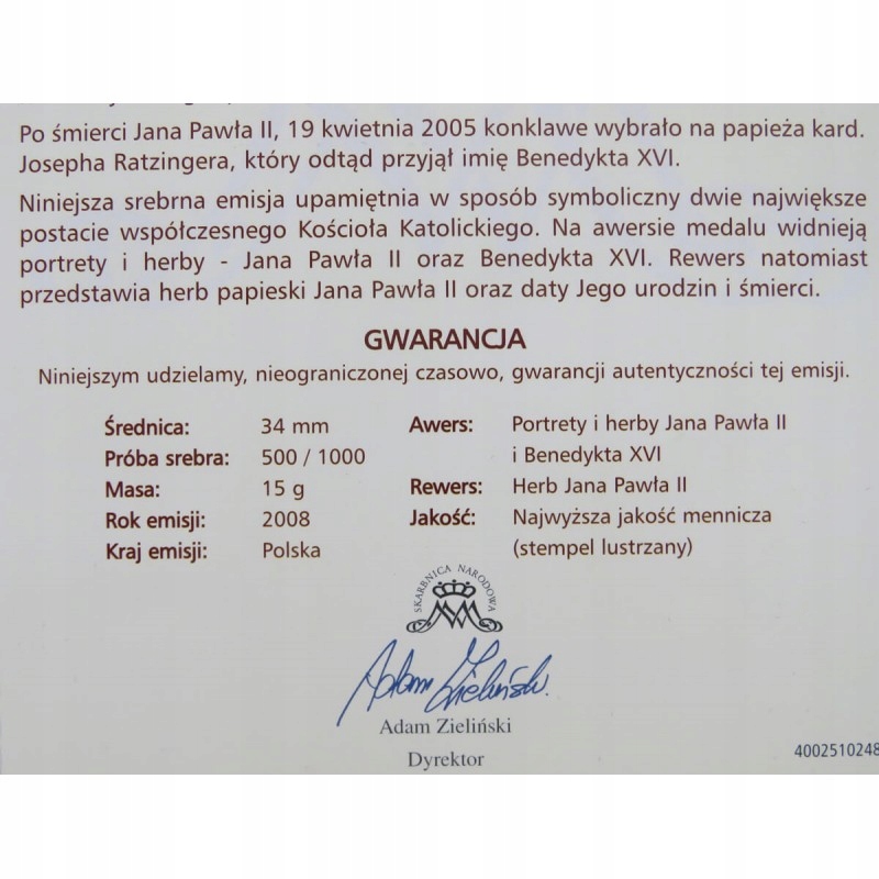 Польща, медаль Івана Павла ІІ та Бенедикта XVI, сертифікат
