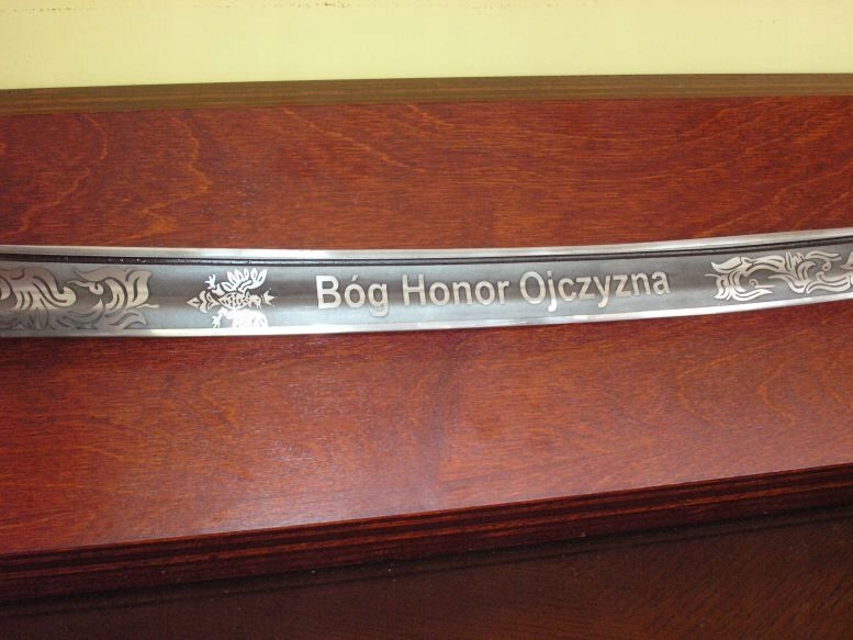 Це зброя з дещо кругло вигнутим клинком, увінчаним пером. Клинок прикрашений рослинними мотивами, польським орлом у короні та написом «БОГУ ЧАСТИТЬ Батьківщину». Друга сторона гладка.