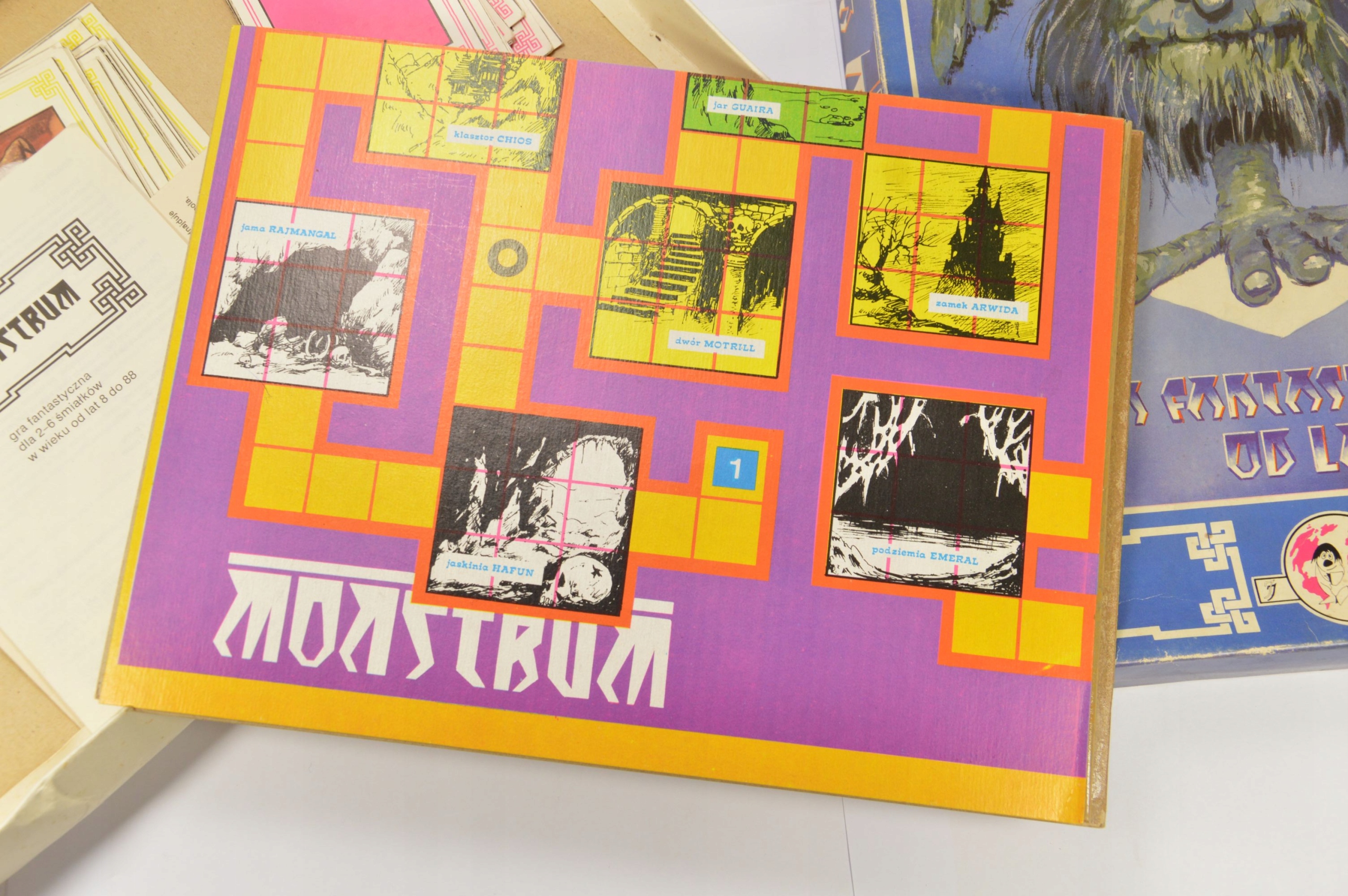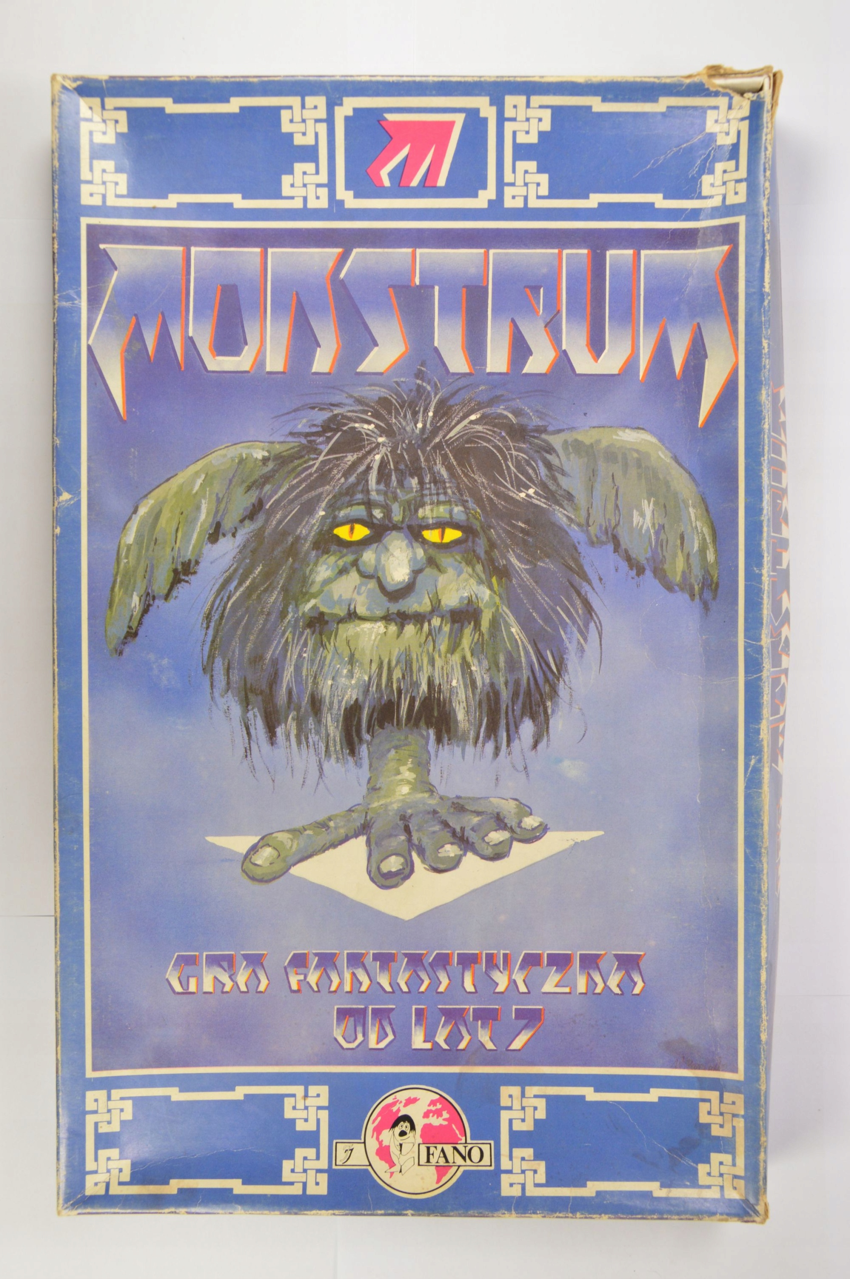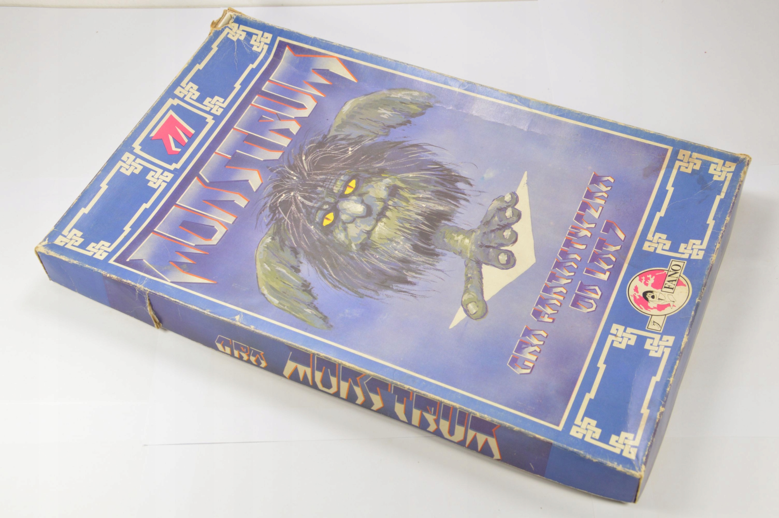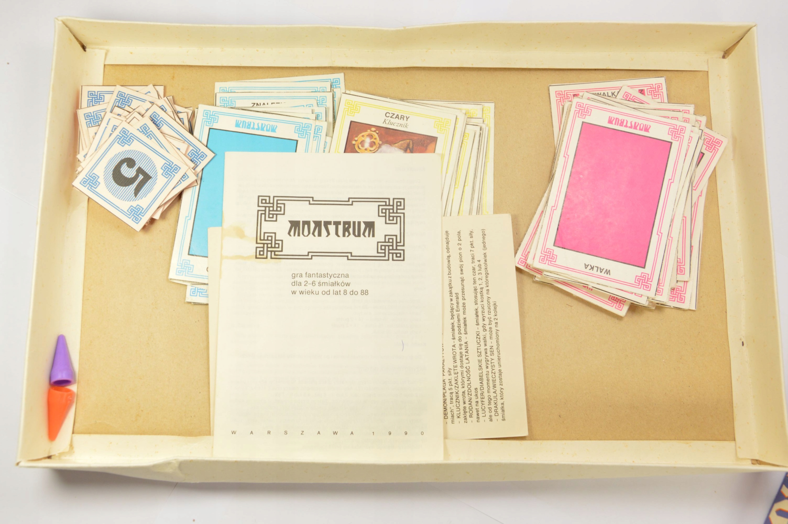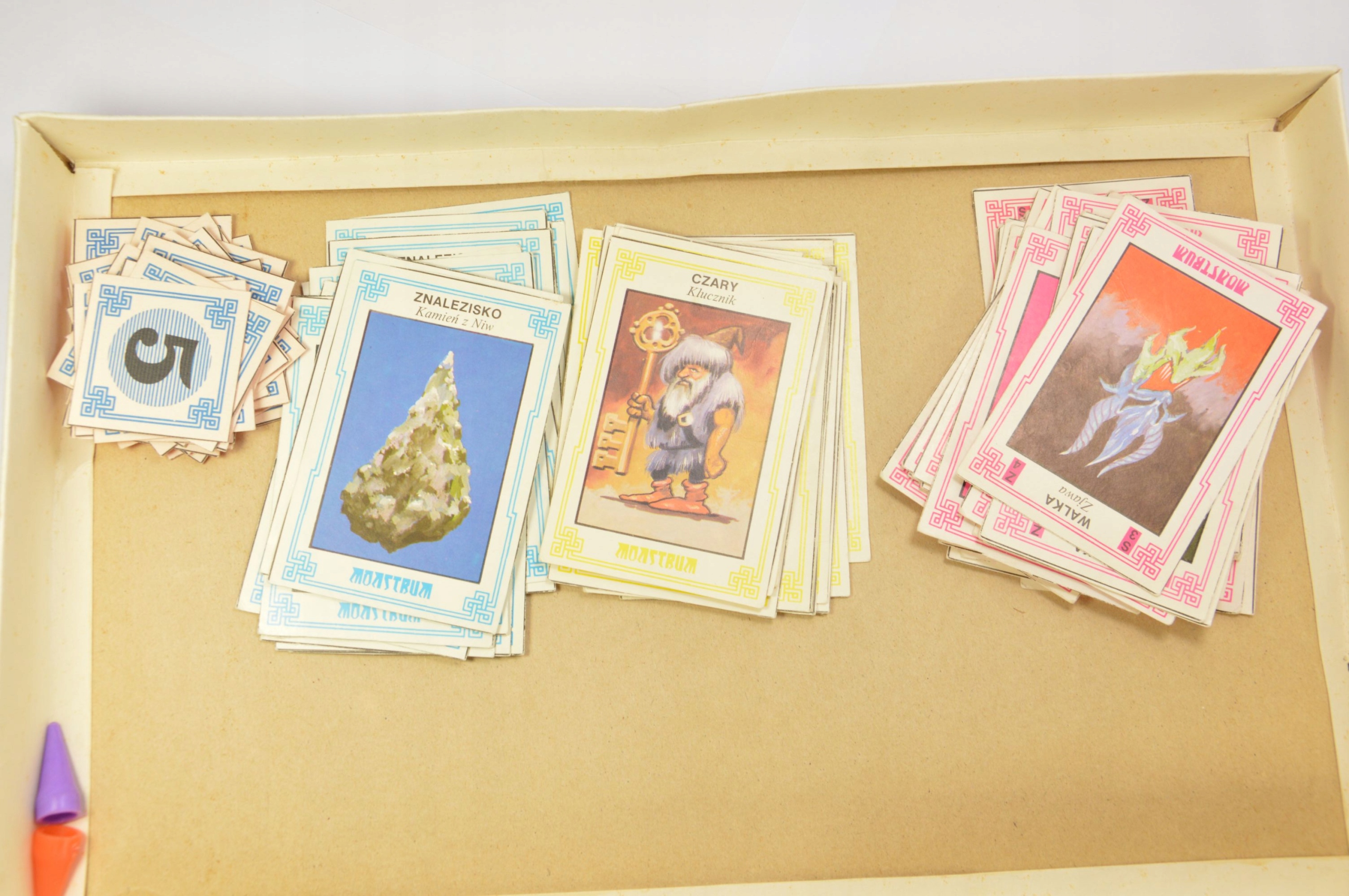Оригінальна, польська фантастична - настільна гра, Monster 1990, що входить до набору дошки, набір карт у черзі зі списком: 23 бойові картки, 16 карт заклинань, 16 знахідок знахідок, 30 карт руху, 2 оригінальні пішакки, список та інструкції, не кубики, дошка, дошка. Кришка ящиків з видимими пошкодженнями переважно на кутах.