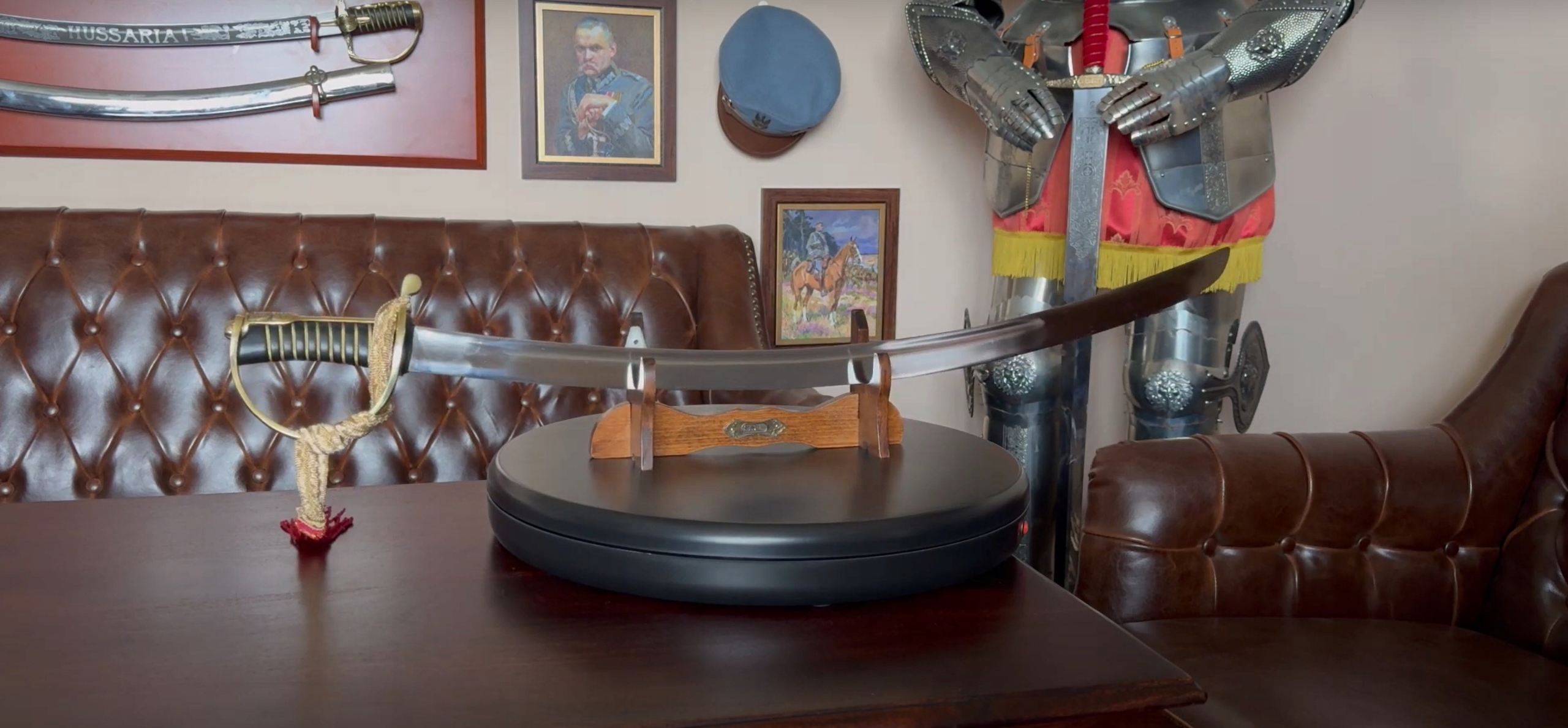 Ручка закрита, з трикутним, латунним джитером, похідним від російської та французької шаблі. Задня частина ручки, покрита латунною, декоративною капюшоном. Дерев’яний вал, покритий чорною шкірою і переплетений золотою ниткою. 4 Лезо (лезо) виготовлено з відшліфованої вуглецевої сталі. Опитування проводиться до рівномірної, матової, гладкої структури. Ми рекомендуємо час від часу лезо зберегти з дуже тонким шаром оливкового або іншого масляного агента, присвяченого обслуговуванню сталі (це допоможе підтримувати високоякісний продукт).