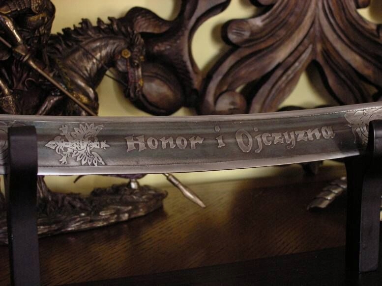 Вигнуте лезо з ледь помітною видно перо, прикрашене рослинними мотивами, символікою білого орла в короні та вигравіруваним написом «ЧЕСТЬ І БАТЬКІВЩИНА».