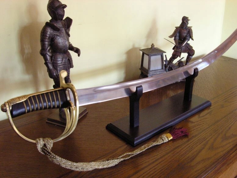 Рукоятка закрита, з триважільною гардою, що походить від російської шаблі. Тильна сторона ручки покрита золотим, декоративним капюшоном. Дерев'яна ручка, обшита чорною шкірою та обплетена золотою ниткою.