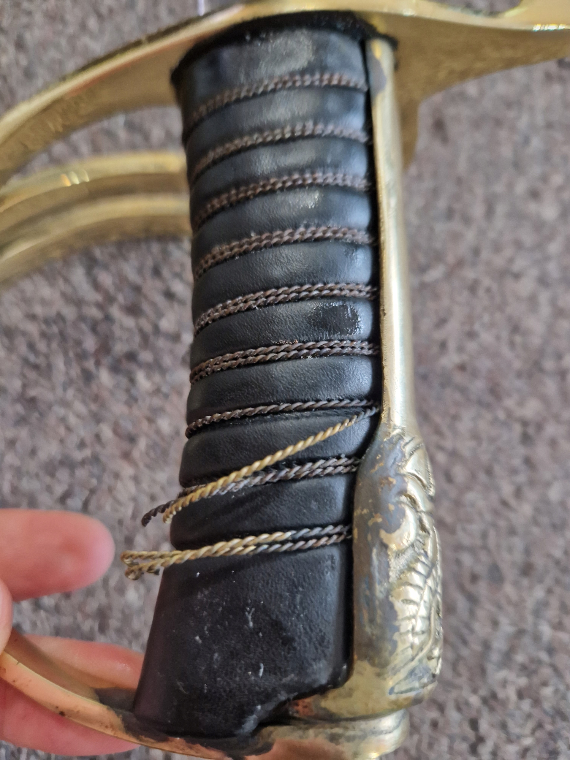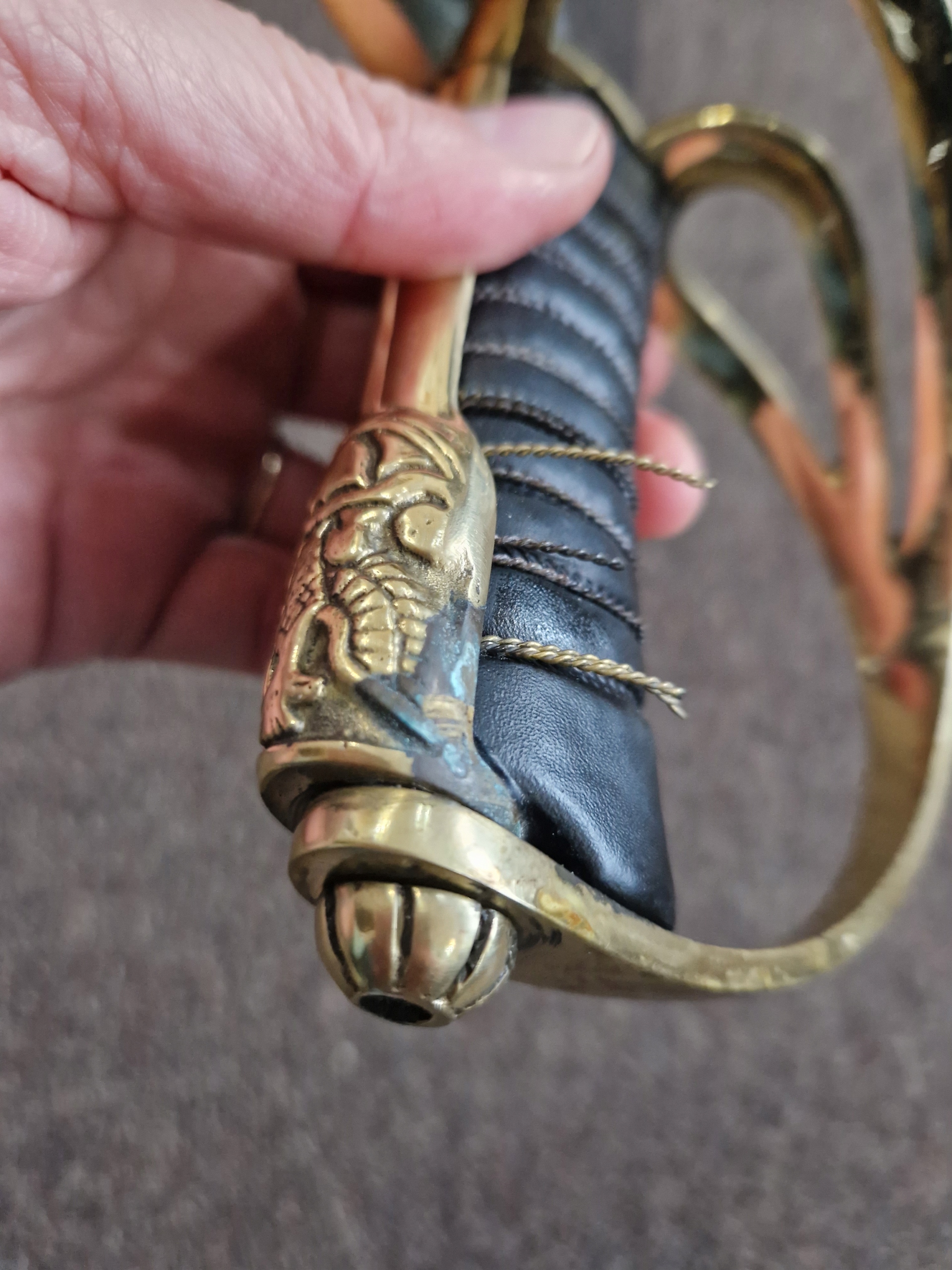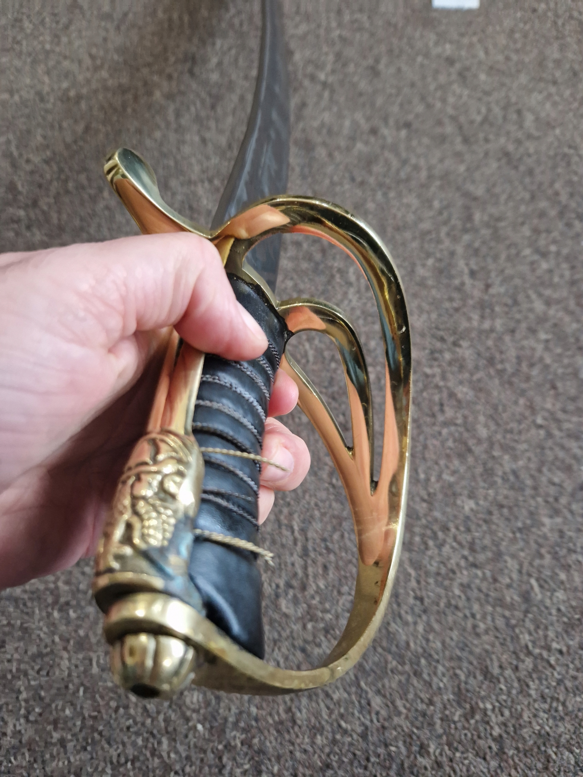 Ручка повністю закрита, в золотій оправі. Перев'язаний декоративними китицями. Хрестовина з трьома луками, зігнутими у вигляді т. зв полустремено - бічні дужки, зігнуті сигмоподібно, сходяться в середині передньої дужки. Заднє плече хрестовини має краплеподібний кінець. Стрілка обтягнута чорною шкірою, золотою ниткою і декоративним капюшоном.