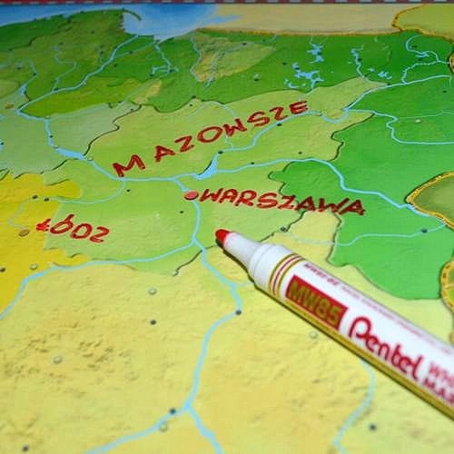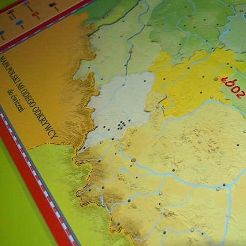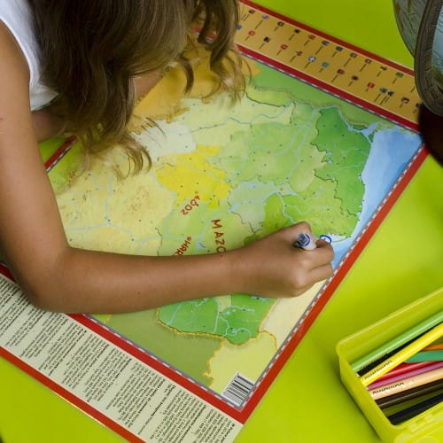 Якість та естетика виготовлення роблять це прикрасою кімнати дитини. Інша сторона колодки представляє карту без піктограм з помітними точками, що відповідають розташуванню окремих міст. Завдяки цьому карта служить ідеальним інструментом для вивчення географії. Окремі точки можна описати за допомогою сухих маркерів Wipe, а ламінування охоплює довговічність карти.