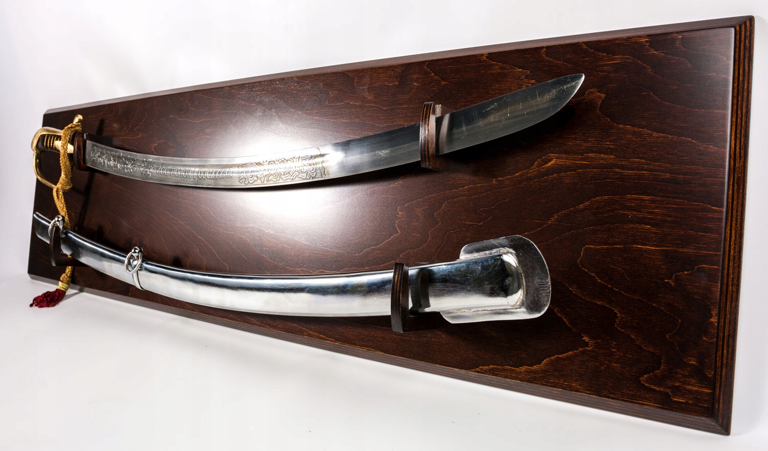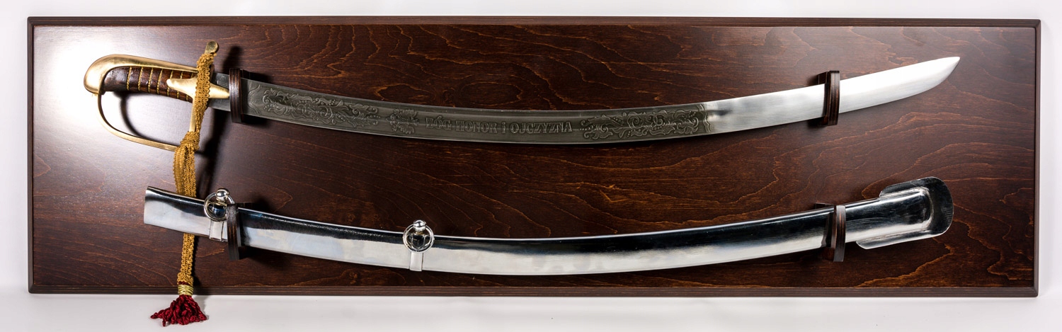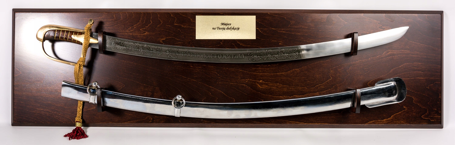 вал ручки, виготовлений з екзотичної деревини, змащена . Видимі нотатки, наповнені латунним скрученим дротом, таким чином -кальованим шрифтом. Міст - сміливий - лук з вусами, в яких рука також захищена від порізів, спрямованих на ручку. Високоякісне сталеве лезо не загартовувалося, зберігається в напівматті. На зовнішній земноводці, прекрасне травлення: "Боже честь і батьківщина" . Декоративна слінг, прив’язана до ручки, виготовленої з матеріалу, золота стрічка закінчується червоною китицею - купою нитки. Вагінська олово, нікель, з двома бурчаннями та рухомими колапами, закінчується шпонею. Прекрасно зроблена шабля, вона виглядає ефективно на прикріпленому табло. Табло, виготовлений з фанери, забарвлених і лакована для килима. На задній частині столу два гачки, щоб повісити на стіну. Робота польського майстра для презентації білої зброї.