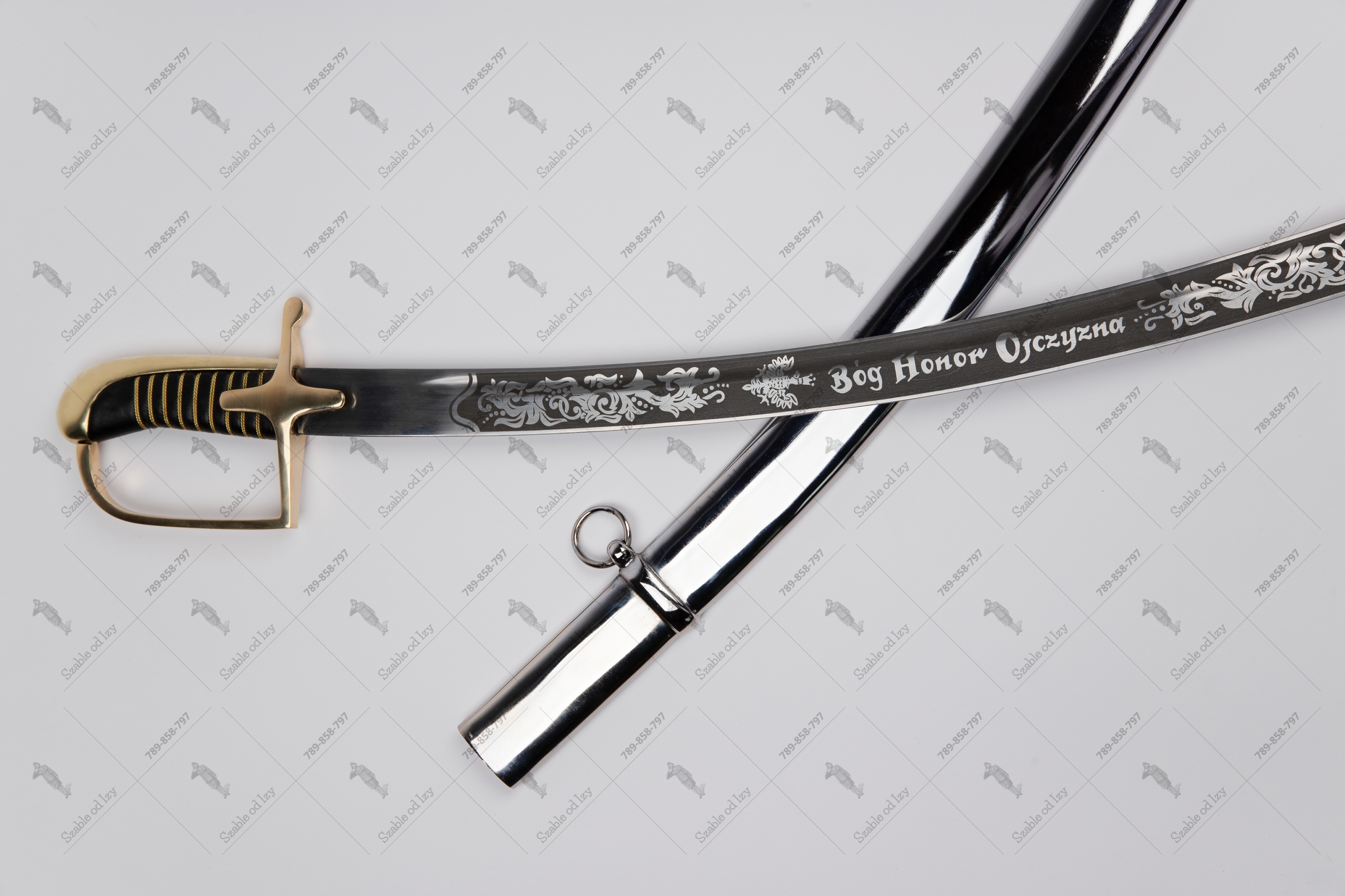 Лезо виготовлено з високоякісної незагартованої сталі з напівглянсовим покриттям. На зовнішній стороні амфібії чудове гравюро: "БОГУ ЧЕСТЬ І Батьківщина". Додатково до ручки прив'язана декоративна перев'язка з тканини, золота стрічка з червоною китицею - пучком ниток. Піхви з нікельованого листового металу, з двома пазами і рухомими кільцями, що закінчуються шпорою. Добротно зроблена шабля, ефектно виглядає на прикладеному столі. На задній частині столу є два гачки, які можна повісити на стіну.