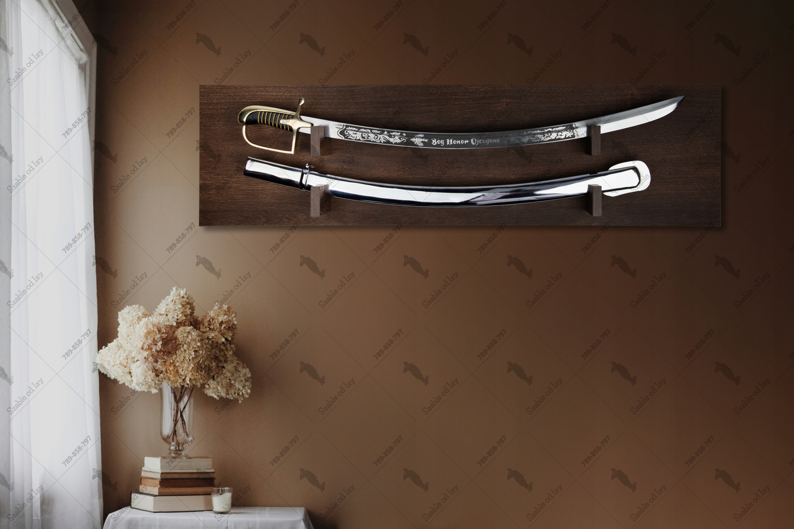 Репліка: офіцерська шабля зразка 1921/22 рр. з піховами, в комплекті з підвісною дошкою. Гравюра: «БОГУ ЧЕСТЬ І Батьківщину».