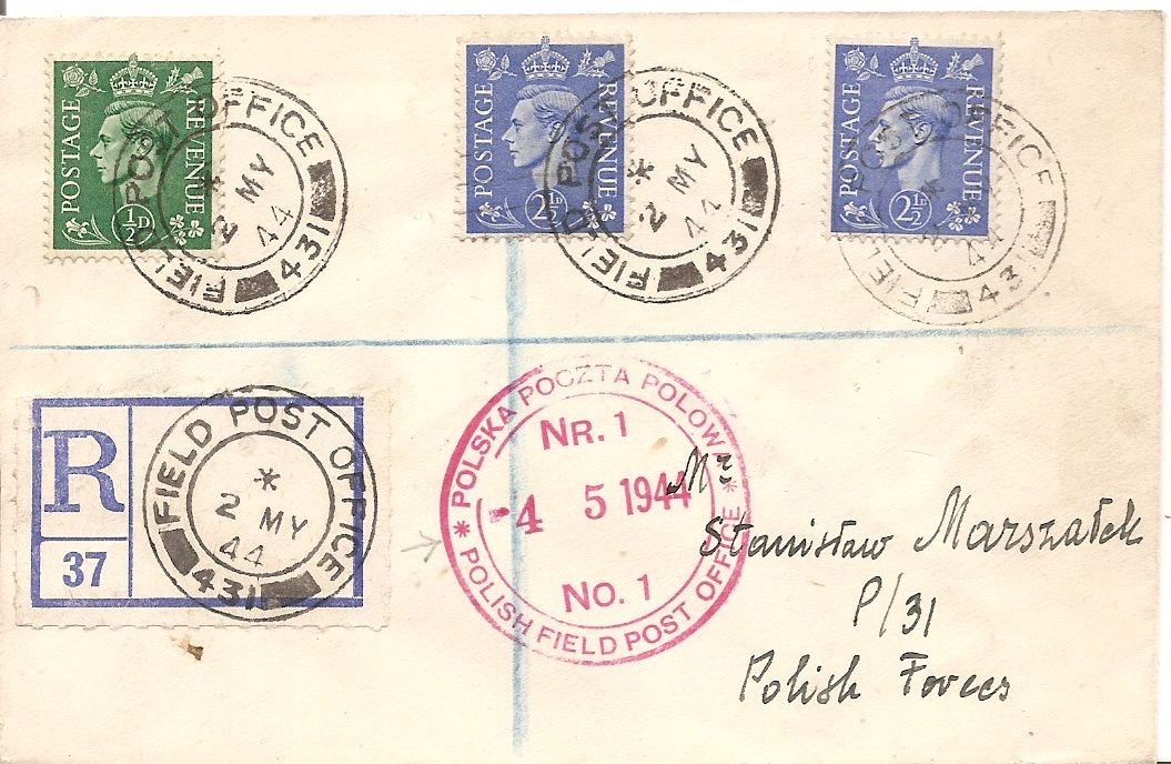 POLSKA POCZTA POLOWA NR 1 -stemple na kopercie -1944 rok -polecony