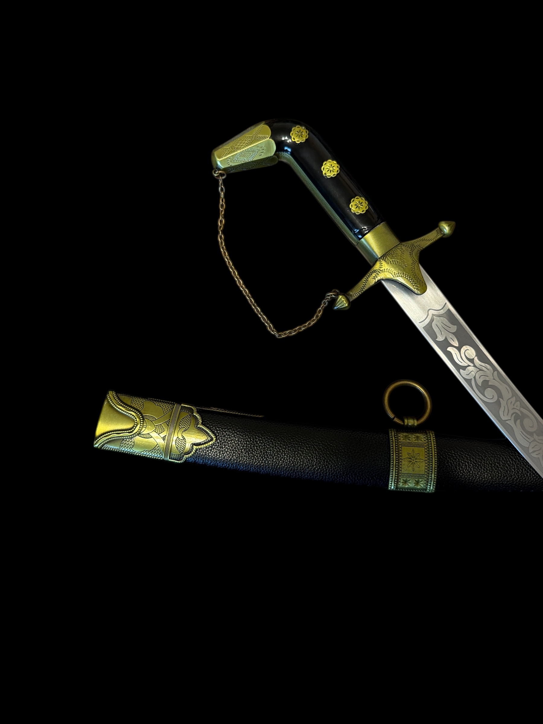 Піхви: дерев'яні, оздоблені чорним. екошкіра. Фурнітура зі сплаву цинку та алюмінію з багатим гравіюванням