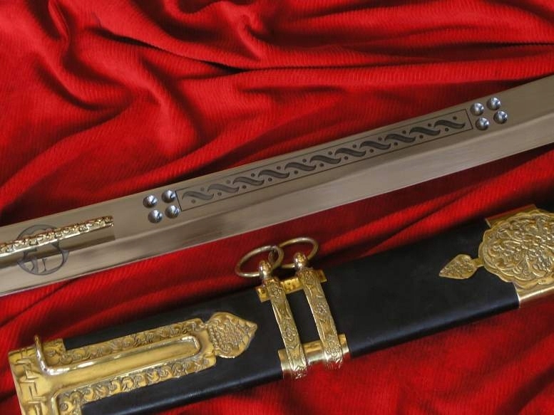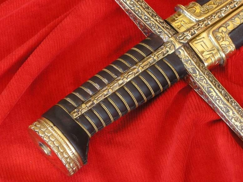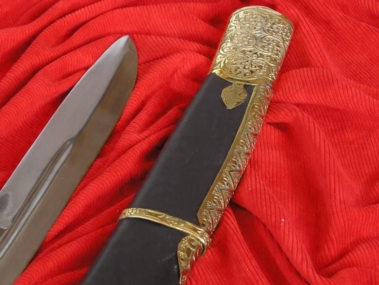 Те, що доповнює його королівський характер, це красиві чорні піхви, оббиті натуральною шкірою та багато прикрашені оригінально декорованими латунними фітингами та двома подвійними пазами з чотирма рухомими кільцями.