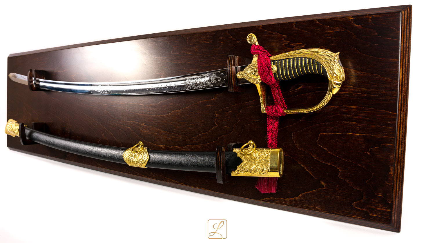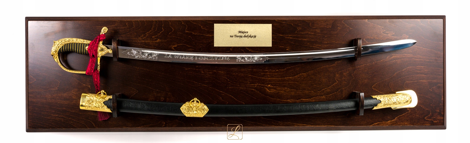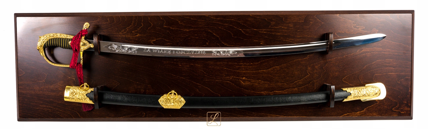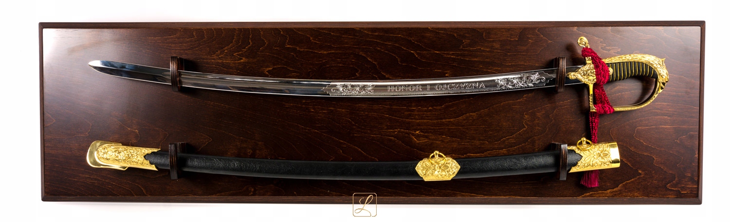 Нова офіцерська шабля зразка 1921/1922 рр. з унікальною декоративною рукояткою, піхвами, хромованим клинком, в комплекті з підвісною дерев'яною дошкою. Ручка і фурнітура блискуче золото. Представлений набір - робота польських майстрів.
