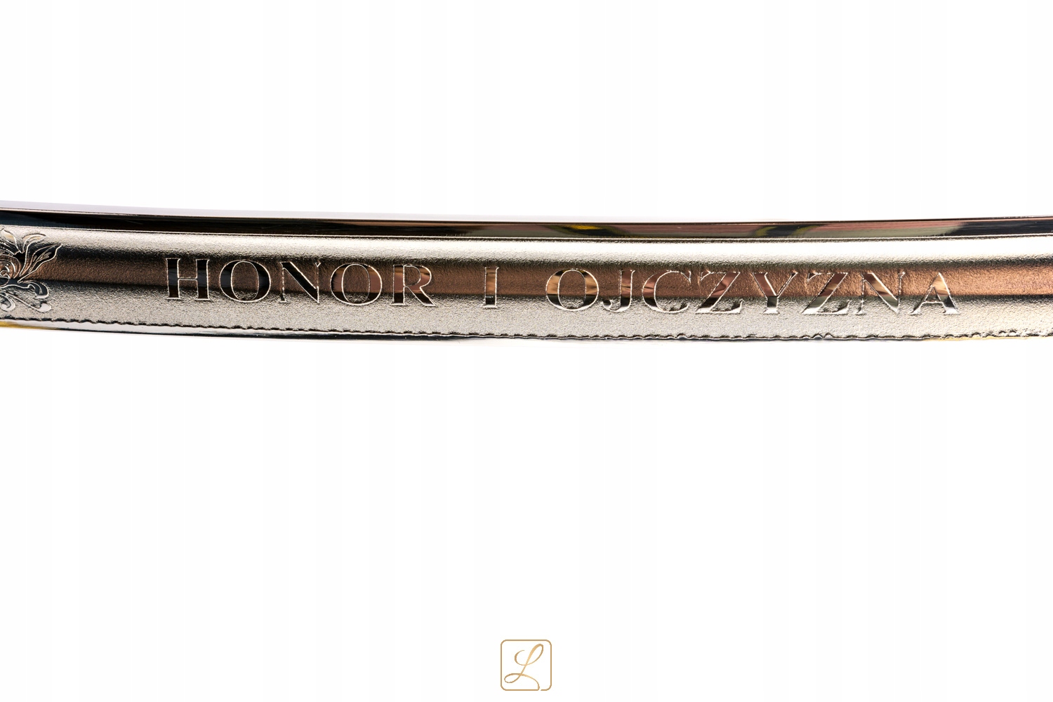 Корпус ручки виготовлений із пластику. Видно насічки, заповнені крученим латунним дротом, т. зв обрізка. Вуса хрестовини у вигляді картуша з характерним написом "Бог, Честь, Батьківщина". Голова має вигляд голови орла, а капюшон прикрашений пір'ям. Клинок виготовлений з високоякісної незагартованої сталі, хромований. На зовнішній поверхні гарне гравіювання: ЗА ВІРУ І Батьківщину, а на внутрішній поверхні ЧЕСТЬ І ВІТЧИЗНУ. На ручку кріпиться декоративна стропа з тканинної стрічки, оброблена китицею-пучком бордового кольору. Клинок не потребує догляду, хромований шар відмінно захищає шаблю від іржі. Піхви виготовлені з матеріалу, що зовні імітує шкіру, декоровані латунною фурнітурою. Чудово зроблена шабля, яка ефектно виглядає на прикладеному столі. Стіл з фанери, вітражений і матовий лак. На задній частині столу є два гачки, які можна повісити на стіну. Робота польського майстра для презентації холодної зброї.
