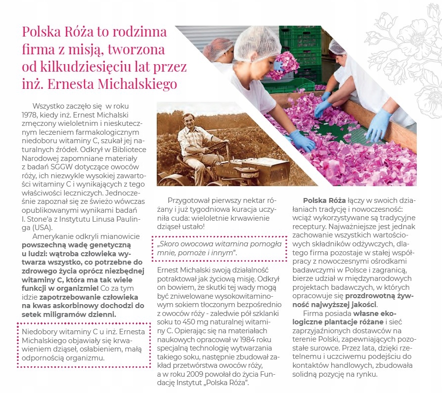 Polska Róża - повністю польська компанія з традиціями. Його заснував 40 років тому, у 1979 році, інж. Ернеста Міхальського, який відкрив багатство плодів троянди. Плоди троянди, сорт Rosa rugosa, є одним із найбагатших джерел натурального фруктового вітаміну С, що росте природним шляхом у Польщі.