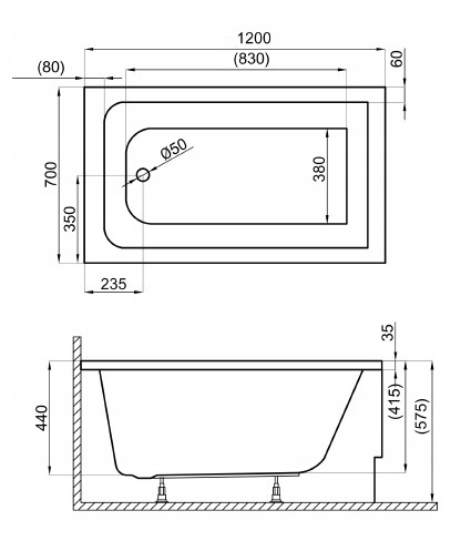 Польська ванна 120x70 Capri з чорним корпусом і глянцевим сифоном