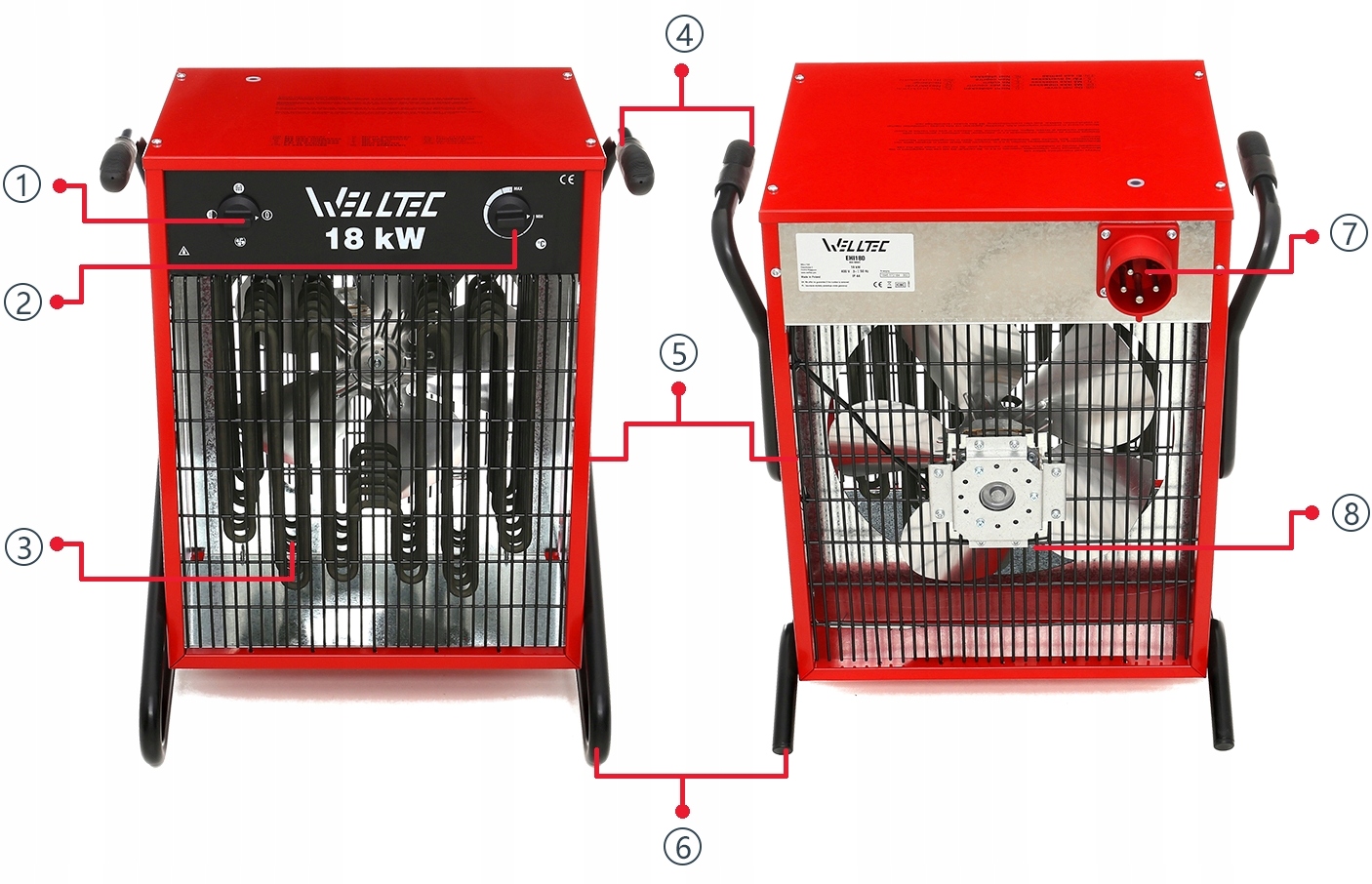 Ступінь захисту нагрівача EHI180 становить 44, а це означає, що він захищений від твердих тіл діаметром 1 мм або більше, а від водних бризів з будь -якого напрямку. Під час дощу ви не повинні залишати обігрівач Welltec у відкритому , незадоволеному просторі. Пристрій виготовлений з прокатної оцинкованої сталі, покрита фарбним покриттям в одному технологічному процесі разом із оцинкуванням. Це дає найвищу якість лаку покриття дуже стійким до подряпин та пошкоджень. ehi180 управління дуже простим - просто встановіть термостат на відповідну температуру і запустіть функцію нагріву за допомогою основного перемикача, який можна встановити на нагрівання з повною потужністю (18 кВт), нагріванням з половиною живлення (9 кВт) та вентиляційною функцією.