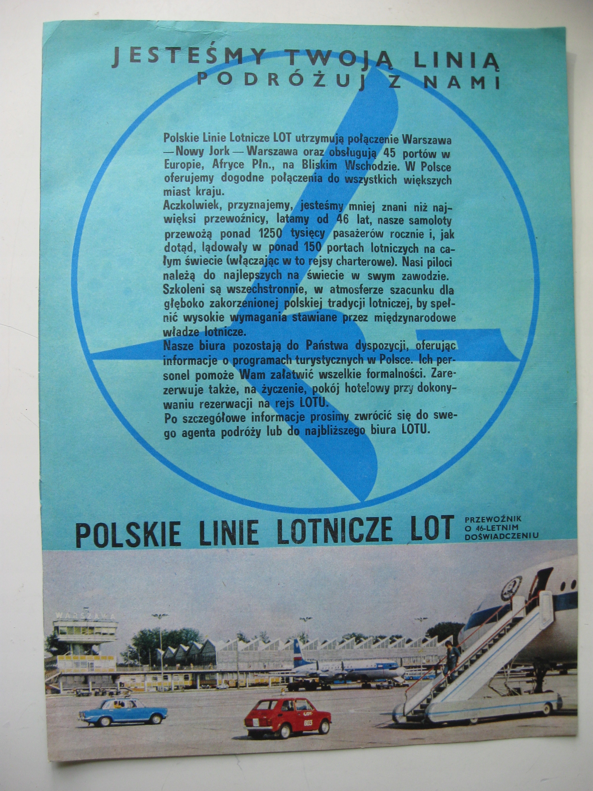На звороті розміщено рекламу LOT із зображенням маленький великий Fiat (як автопарк LOT) на злітній смузі аеропорту